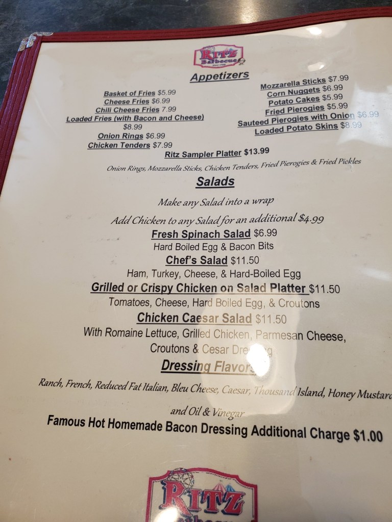 I immediately added Ritz to the list of restaurants in Allentown that I need to try at some point, thus doubling its length. Actually, that’s not quite accurate. I also noticed a hot dog place I want to get to around the same time I found Ritz Barbecue. For anyone who is familiar with Allentown and wondering, I’ve been to a couple Yocco’s Hot Dogs locations already.