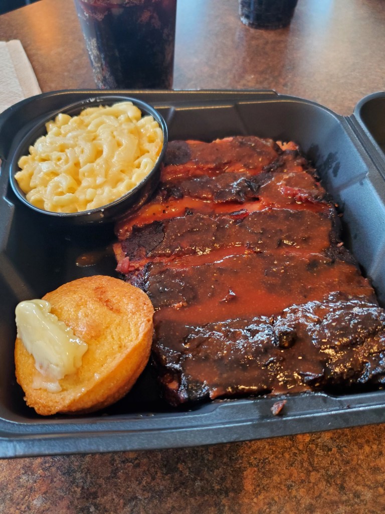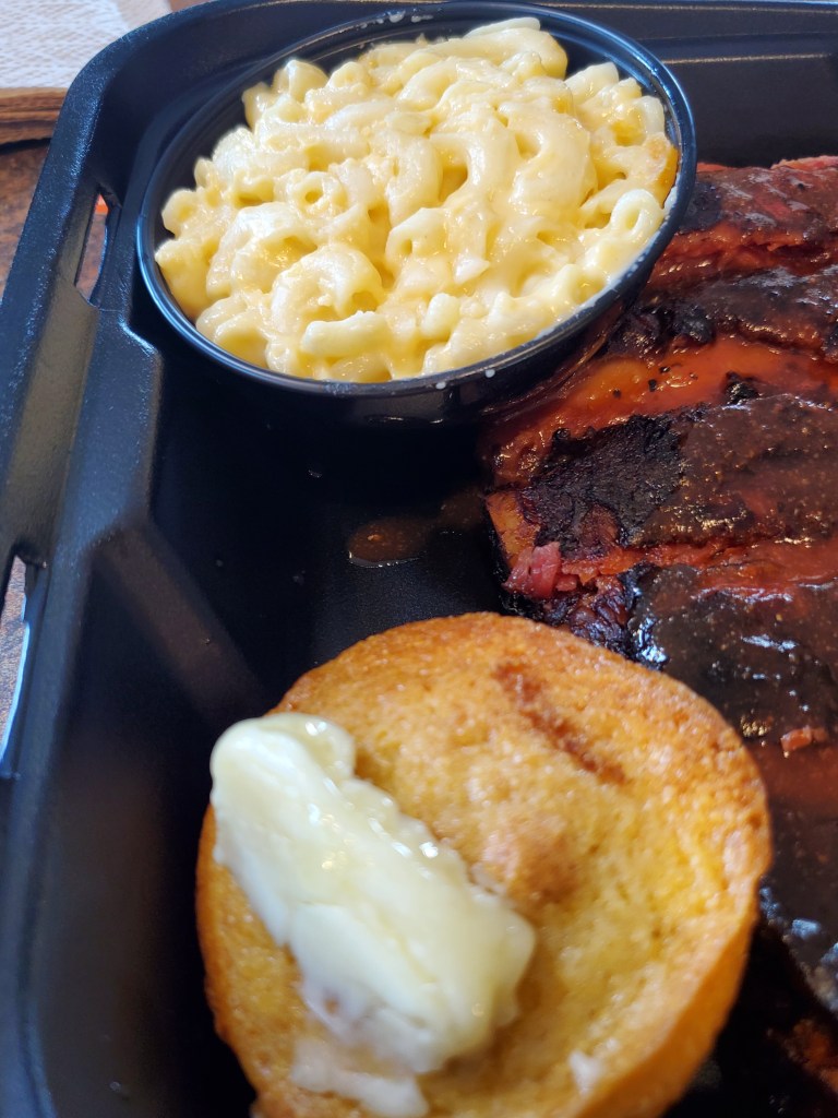 The menu is fairly standard for southern-style barbecue. We ordered two meals – one each with brisket and a half-rack of pork spare ribs. John chose a corn muffin and mac-and-cheese for his sides. I inquired as to whether the collard greens are made with vinegar, which I’m not a fan of. When told they were, I also ordered mac-and-cheese as well as hush puppies. I like hush puppies and they are hard to find in the Philly region, so I was willing to pay the extra $2.75 they charge for them when ordered as part of a meal.