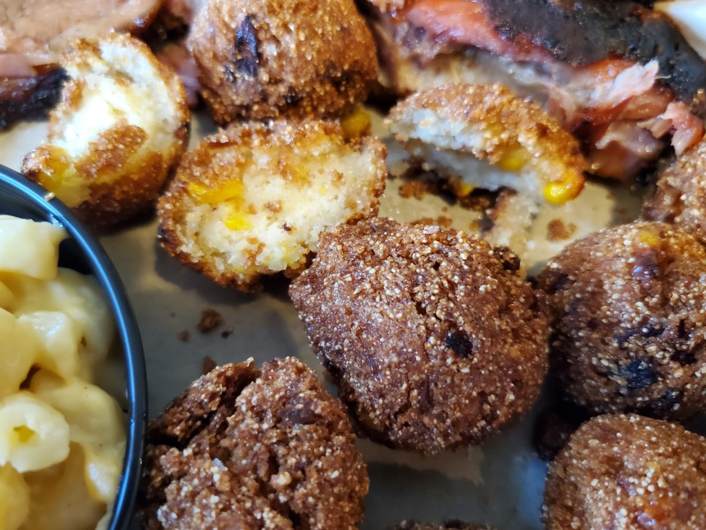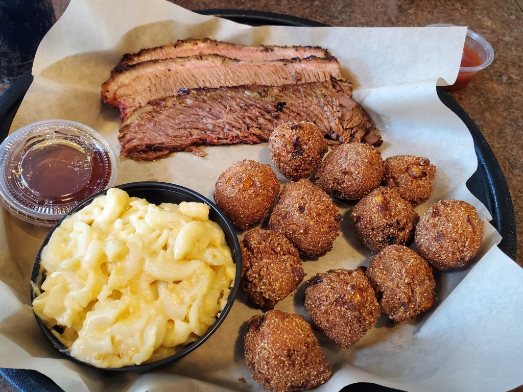 A brisket meal with mac-and-cheese and hush puppies, which came with maple syrup for dipping.