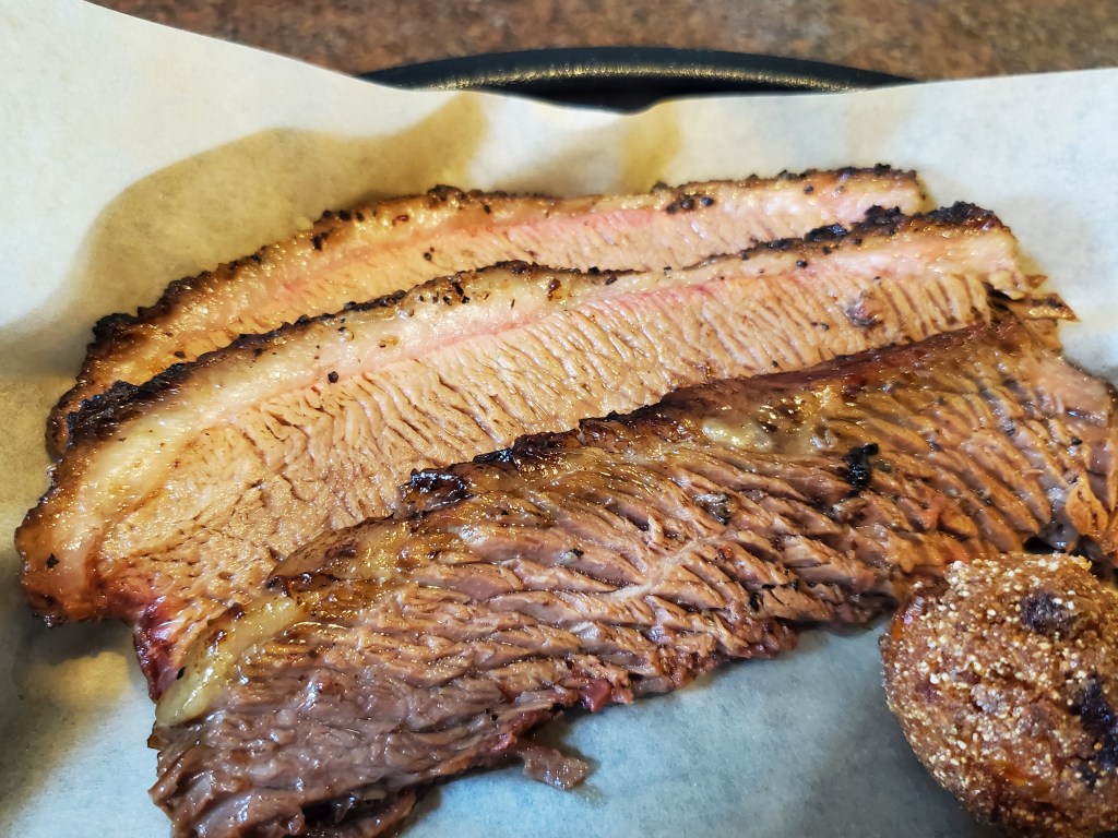 Beautifully succulent smoked brisket. Glare from the overhead lighting caused the two far slices to appear lighter than they actually were.