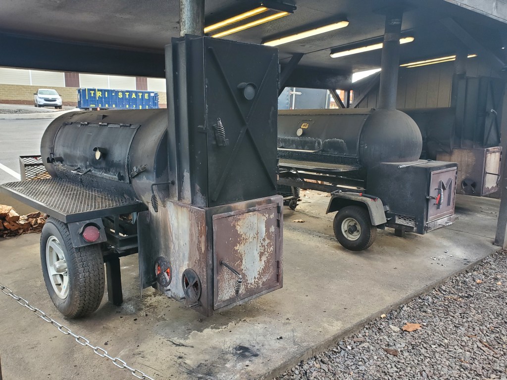 A pair of beautiful wood-burning smokers. The square fire boxes at the ends closest to the camera are where the wood burns, with the heat and smoke sifting into the long cooking chambers through vents.