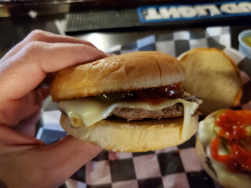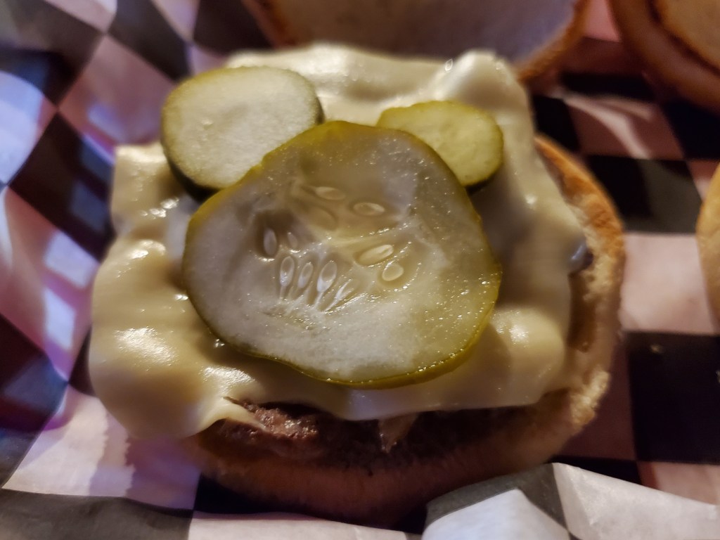 The cheeseburgers came in a separate basket and appeared to be missing the fried onions and pickles I had requested with them. It turned out I was only half right about that. The onions were under the melted cheese. The bartender brought out the pickles and I commenced snapping after placing a few on each burger.