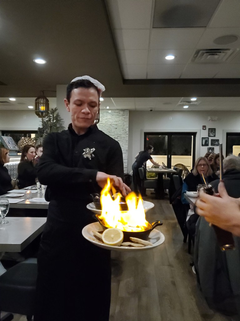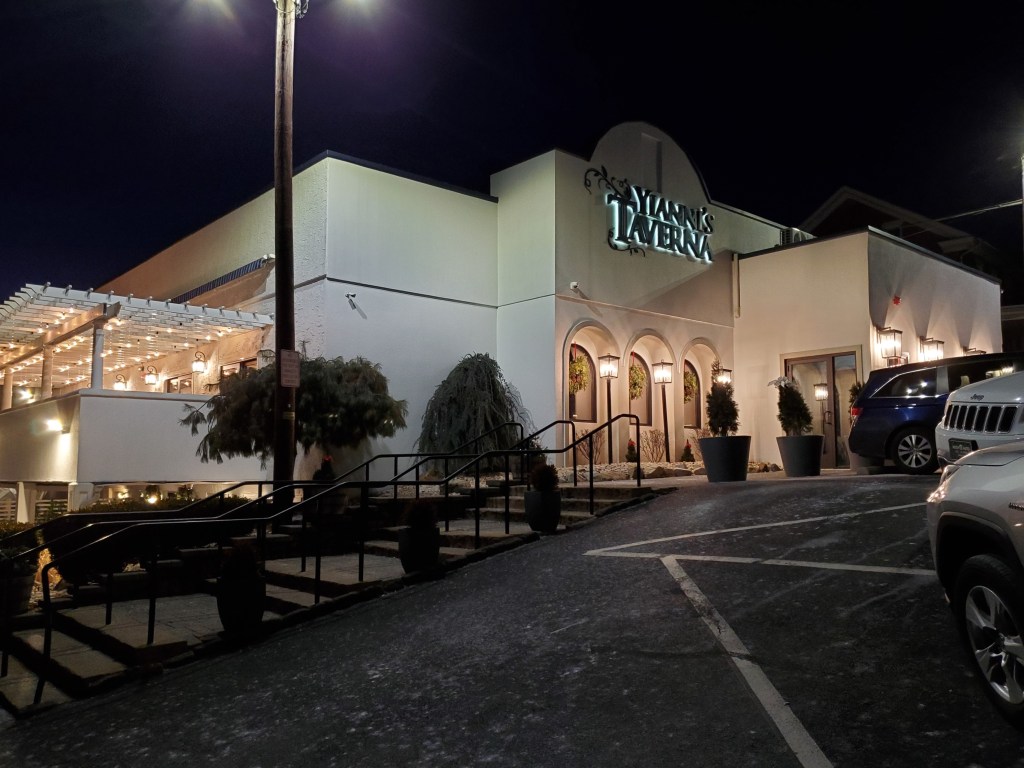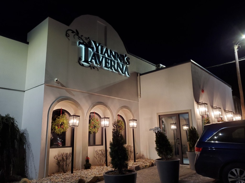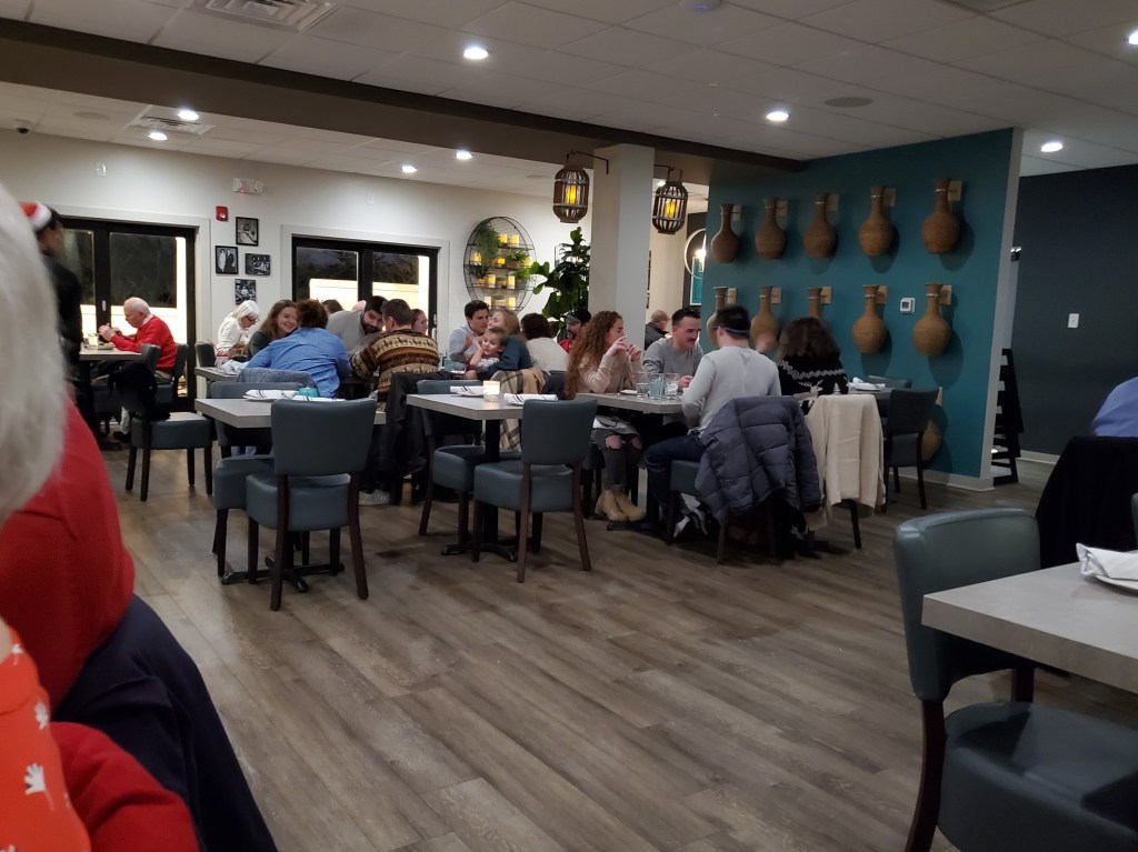 This year’s festivities began at Yianni’s Taverna, a Greek restaurant that is – fittingly – in Bethlehem, PA. We had eaten there once previously for the holiday, but they suffered a fire in the interim and rebuilt the interior so that it was unrecognizable when we walked in. It’s more festive now.