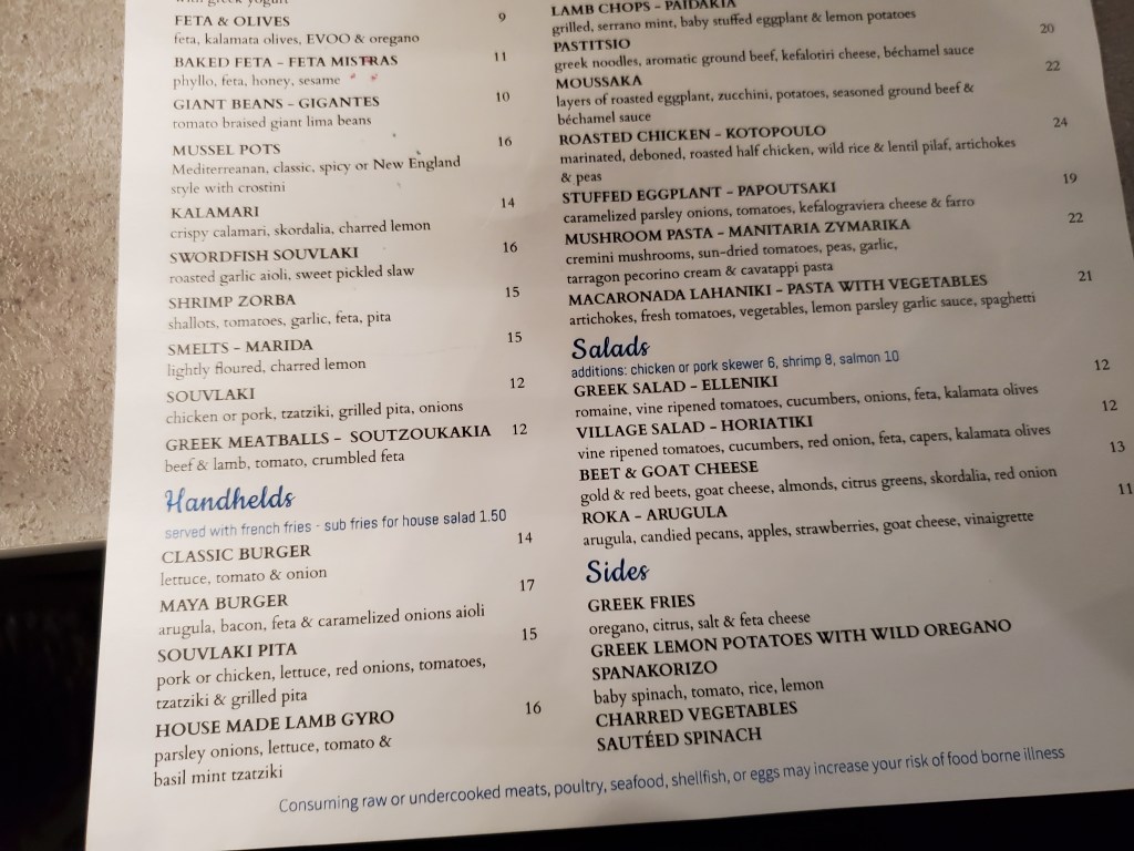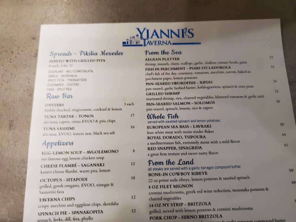 The menu featured much of the standard fare that you’d find at most Greek-American restaurants along with seafood and a selection of steaks and chops.