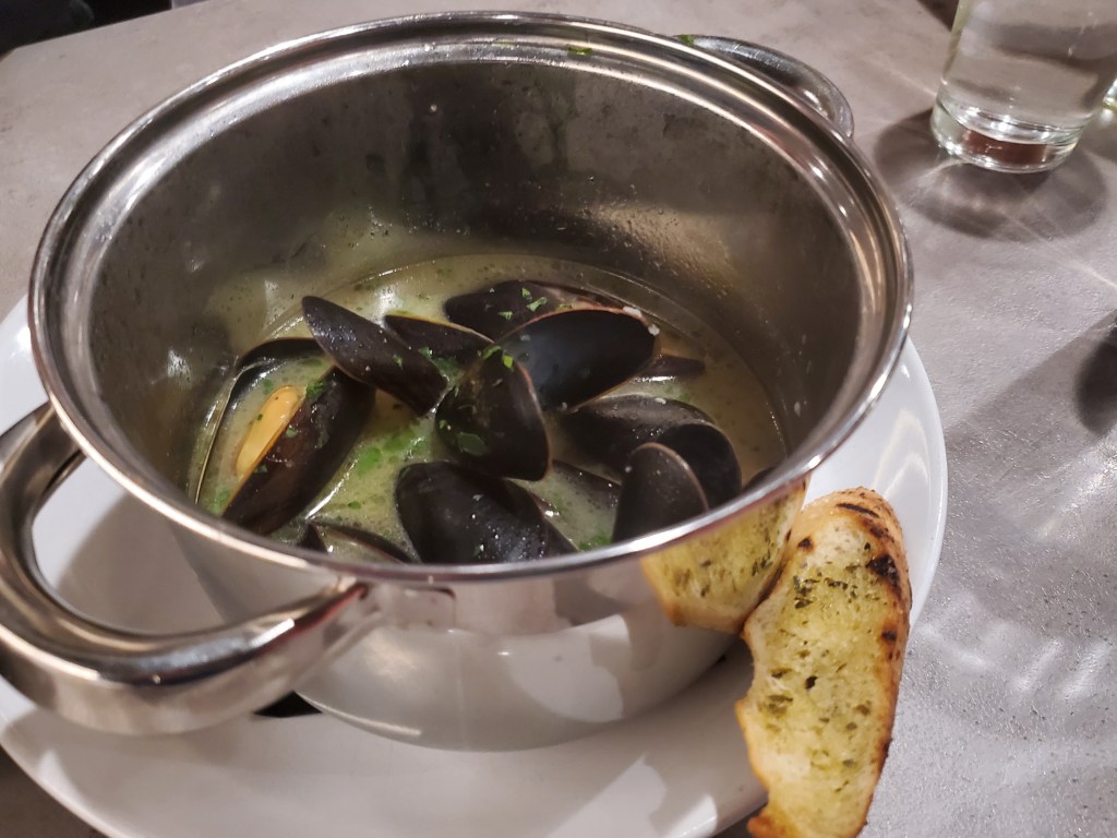 My brother-in-law chose the white wine “classic” sauce for his mussels.