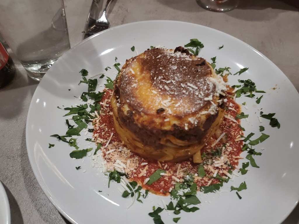 My other brother-in-law ordered Pastitsio, which is like a Greek variation of lasagna, while my father-in-law opted for fish in parchment. I had been thinking of getting the latter right up until I was on the clock. There was also an assortment of vegetables wrapped inside the paper with the fish. It looked very good. I’m sure I’d have liked it.