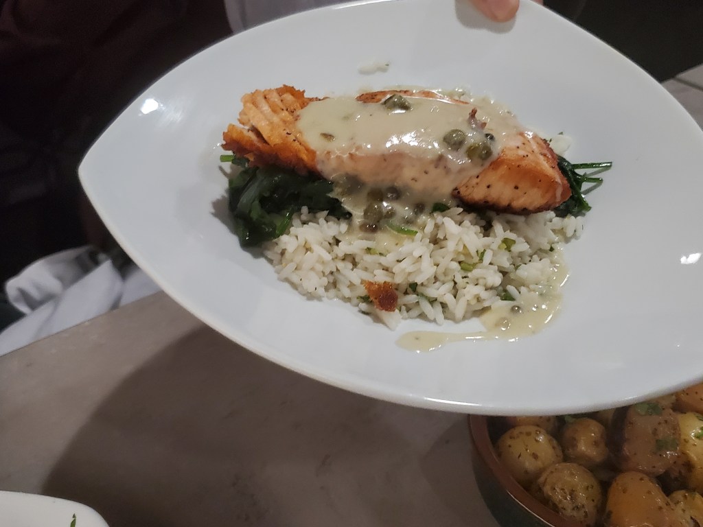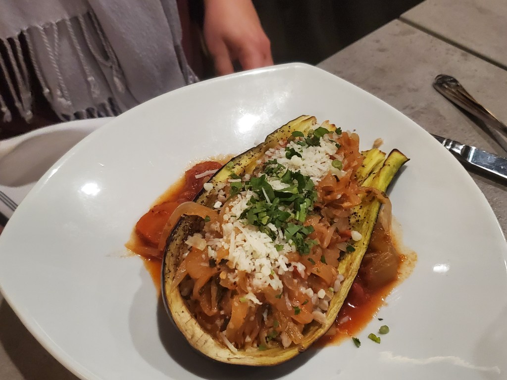 Closing out the entrees, my sister-in-law had pan-seared salmon and my wife went with stuffed eggplant. If you read this blog regularly, you know I’m not a big vegetable guy. And in fact, I don’t eat eggplant at all. But this dish was at least visually pleasing.