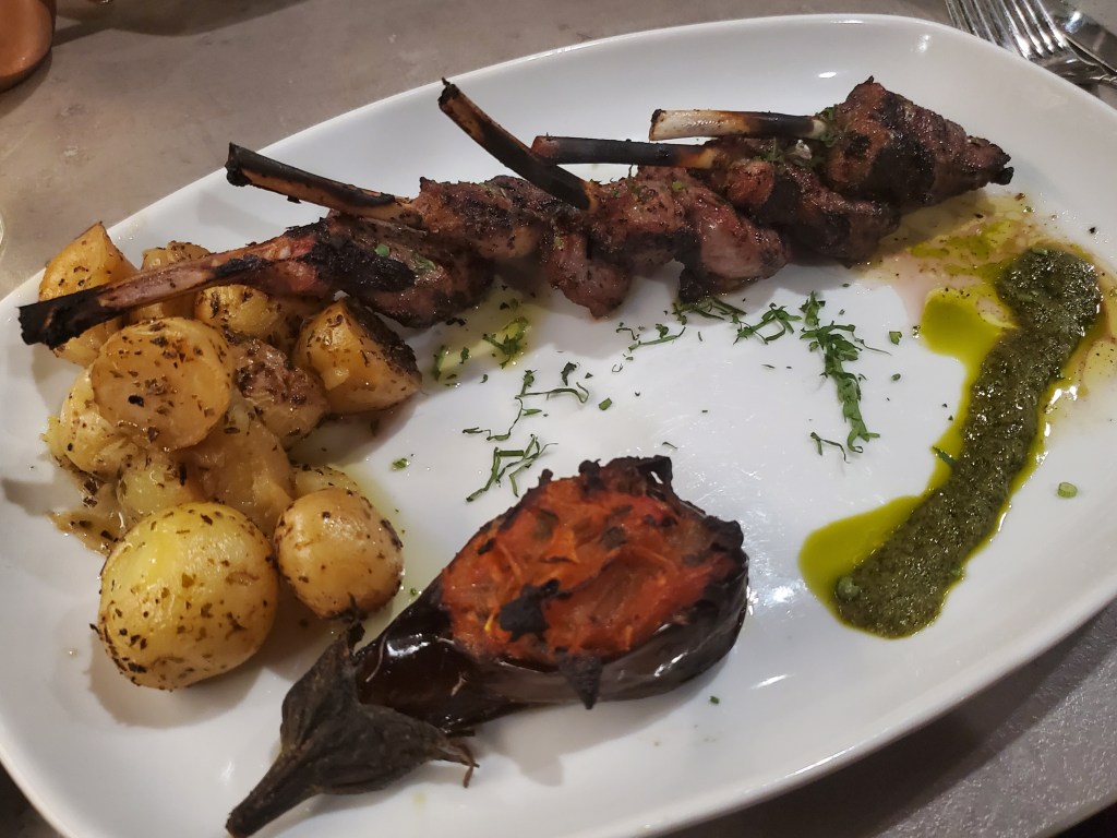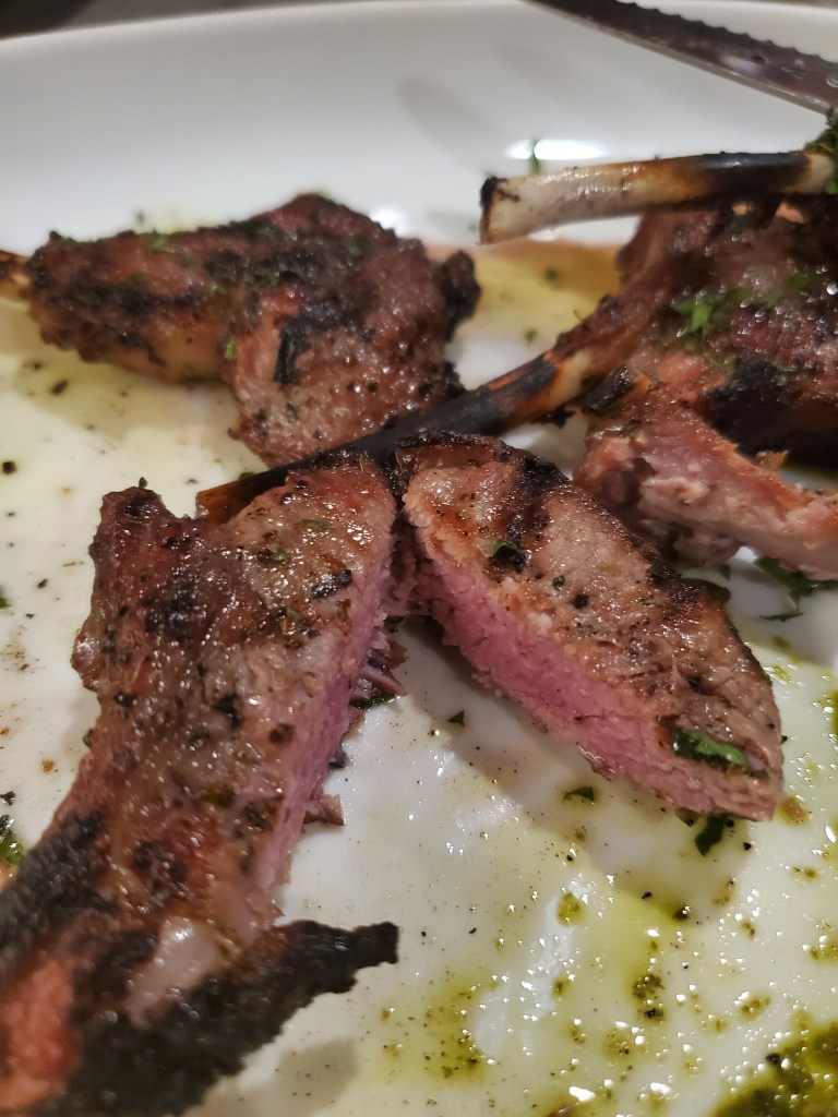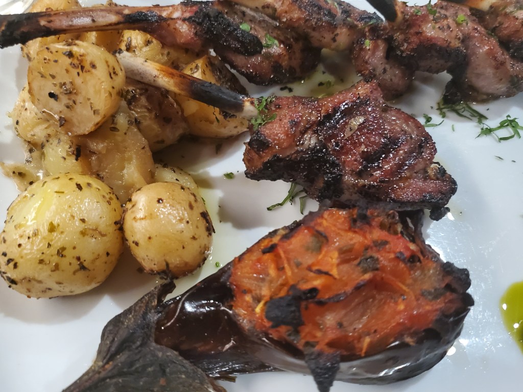 My lamb chops. That’s eggplant closest to the camera. My wife enjoyed it while I was eating the chops.