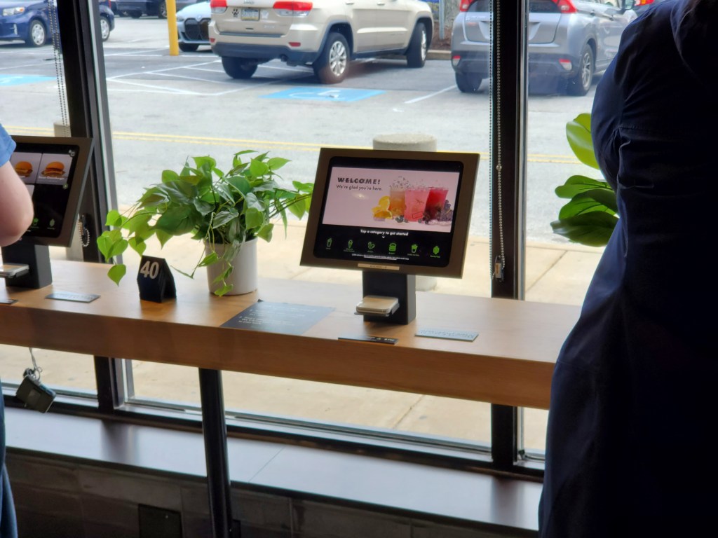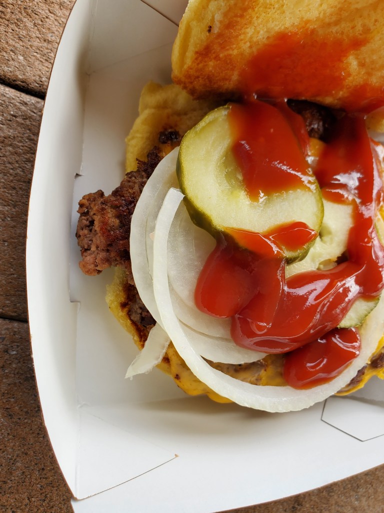 Although they have computers and credit card slots for self-serve ordering and paying, there is at least also an option for counter service. The place was packed and I just went straight to the computer closest to the door to order a cheeseburger with onions and pickles. Ketchup was self-serve and they didn’t offer fried onions. If I had remembered that, I’d have probably ordered my other burger with raw onions for the sake of consistency.