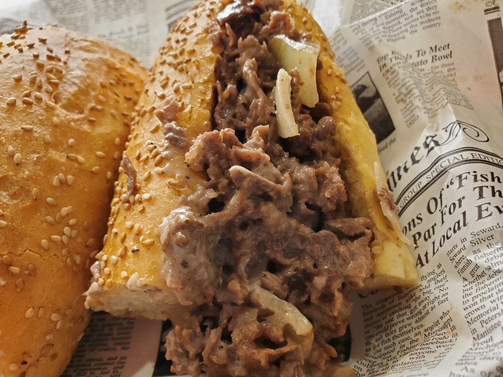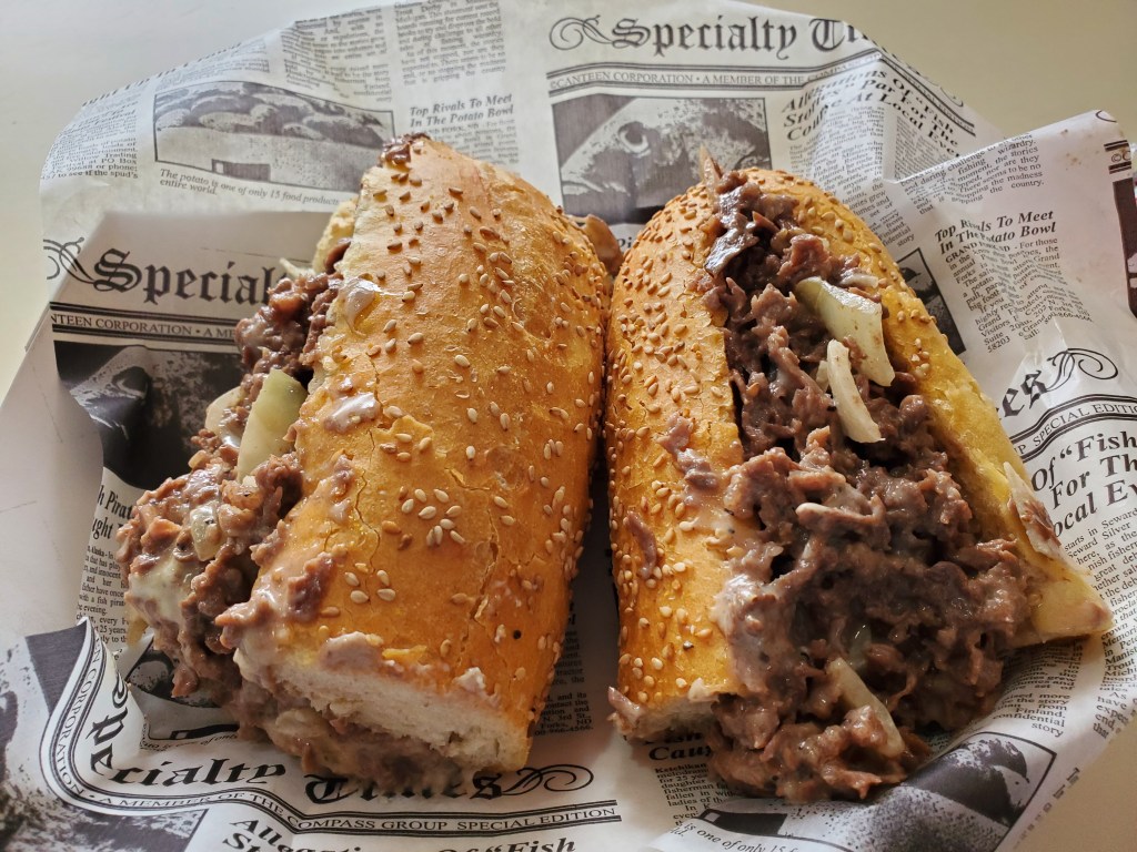 And it was filled with a massive amount of both meat and cheese. There had to be in the neighborhood of a full pound of ribeye on there. It was tough to judge with precision because it was accompanied by so much Cooper Sharp throughout the sandwich. Each half was so stuffed that there was no way to pick one up and start eating without some of the contents falling out onto the paper on which it was served.