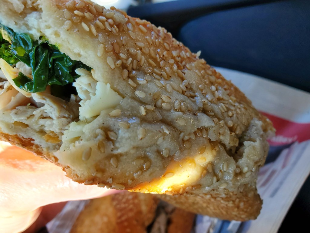 It came on one of the wonderful Sarcone’s seeded rolls that I’ve raved about in several past posts. This is one of the sturdier sandwich rolls out there. The crust requires a vigorous chew and it’s not too doughy. Many rolls would have been soaked all the way through and likely fallen apart with such moist ingredients on it. But not a Sarcone’s roll. It was damp on the bottom, but the roll held strong throughout and there was no leakage while I ate.