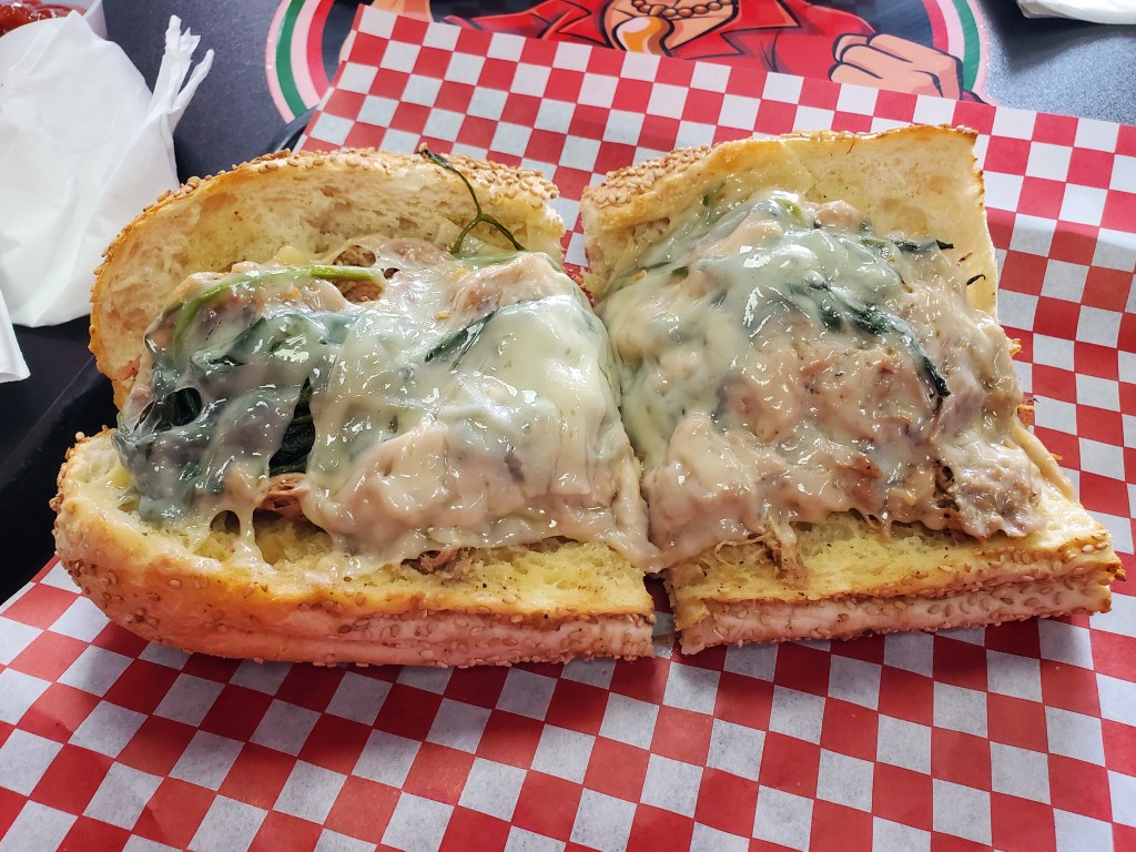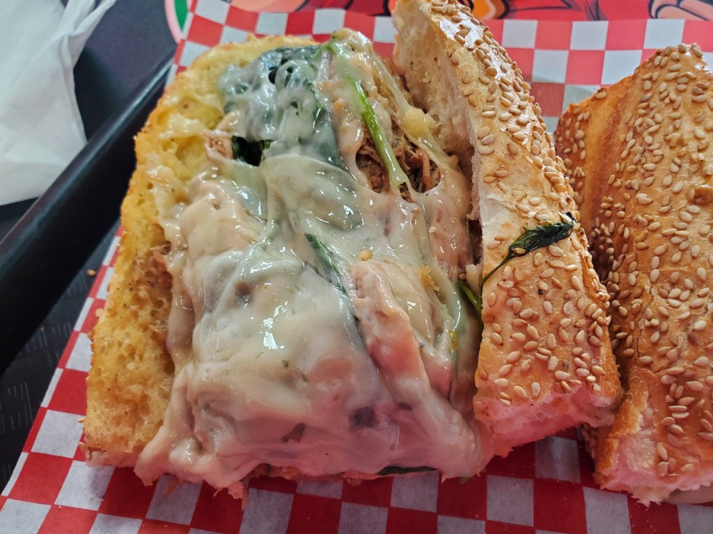 The sandwich appeared to have been prepared like a grinder rather than a traditional Roast Pork Italiano; meaning the entire thing was put in the oven after it was assembled. The roll was toasted and there was a layer of melted provolone on top of the spinach and pork.