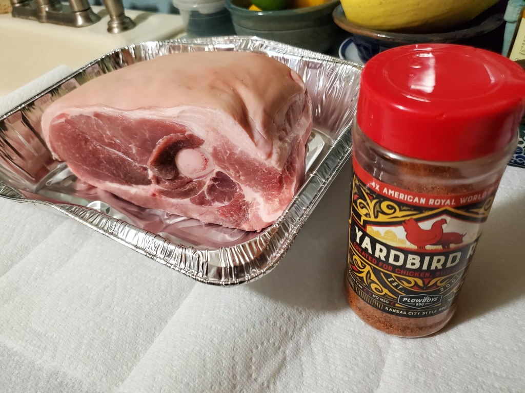 When I took out the roast to prep it Saturday night I found that it had a thick, hard fat cap, into which I cut a series of lines – creating rows of squares. This was done to allow the smoke to penetrate through the fat to the meat during the cooking process. After completing that task, I liberally applied Plowboys Yardbird Rub – my go-to rub for smoking pork – over the entire roast, making sure to get it into all the nooks and crannies.