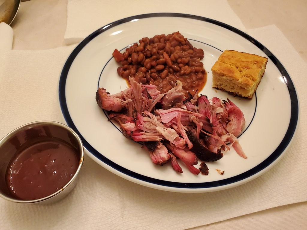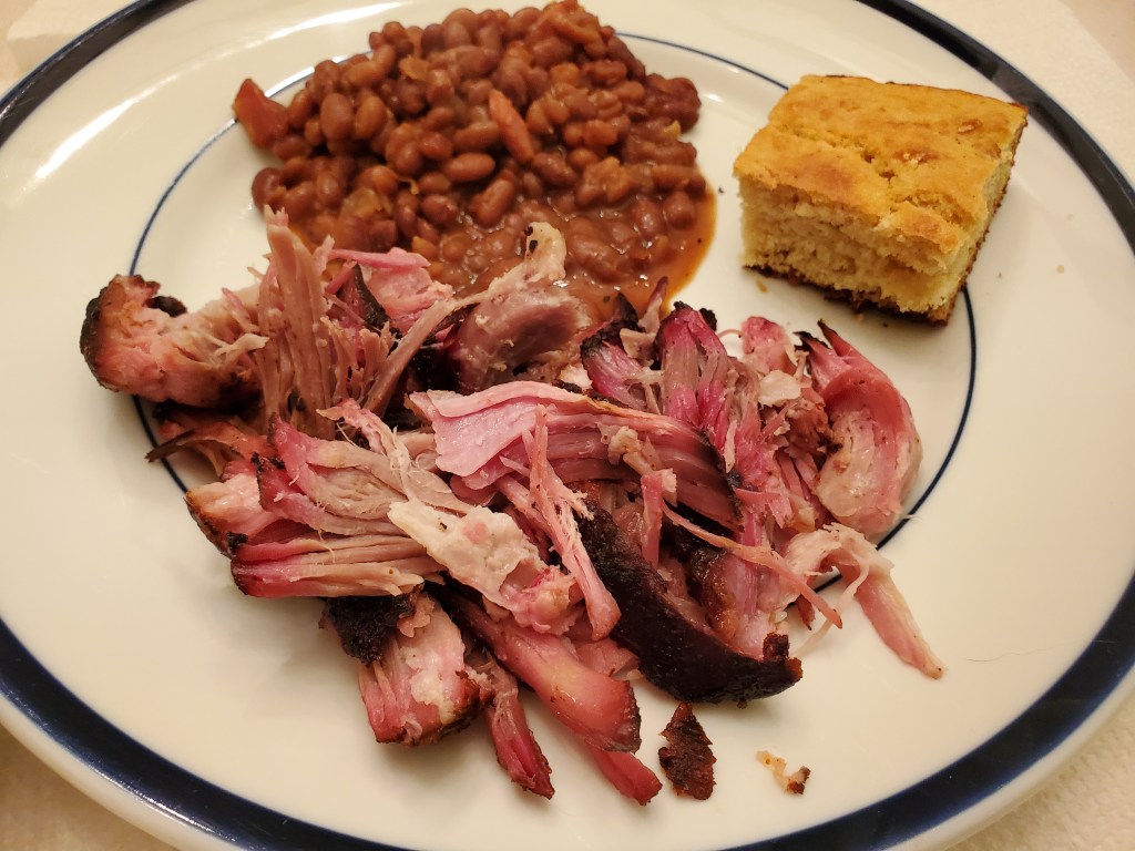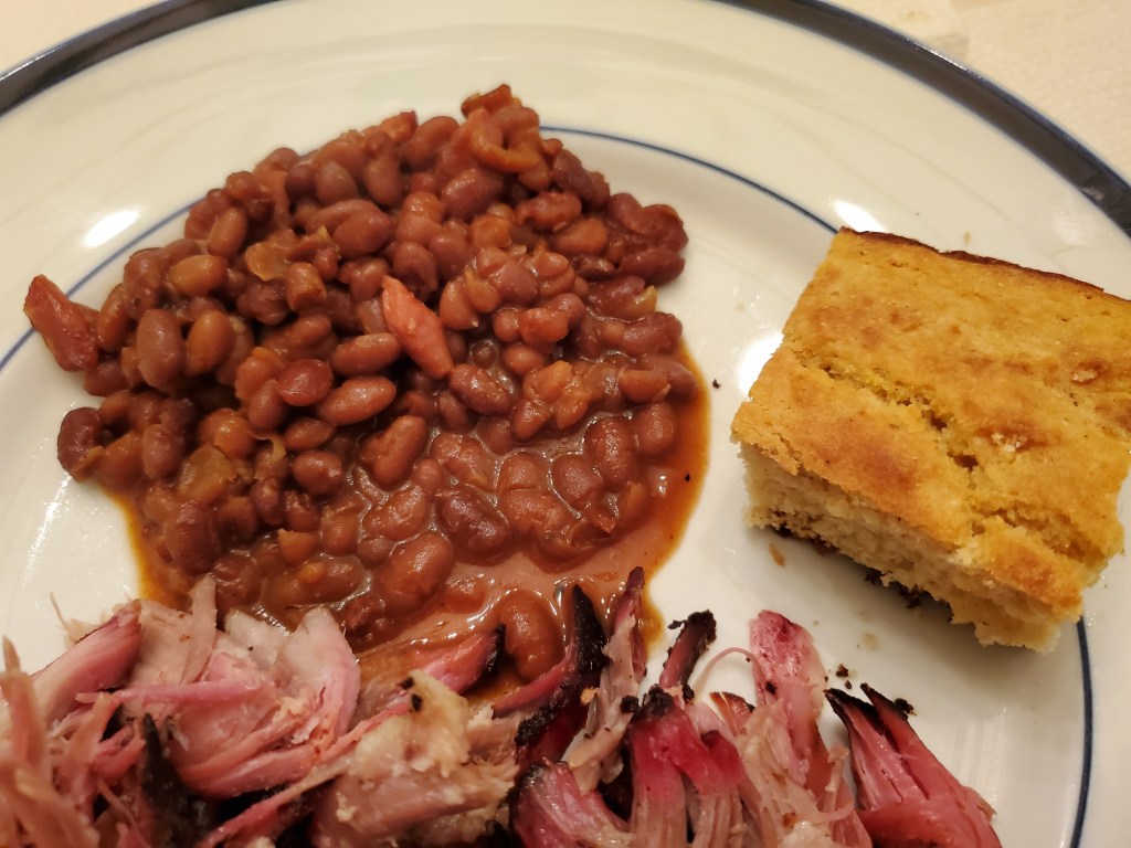 When I picked up a corn muffin to go with the barbecue while we were grocery shopping Saturday, my wife offered to make cornbread instead. How could I pass up that offer? I also heated some baked beans that I had in the refrigerator to go with the pork.
