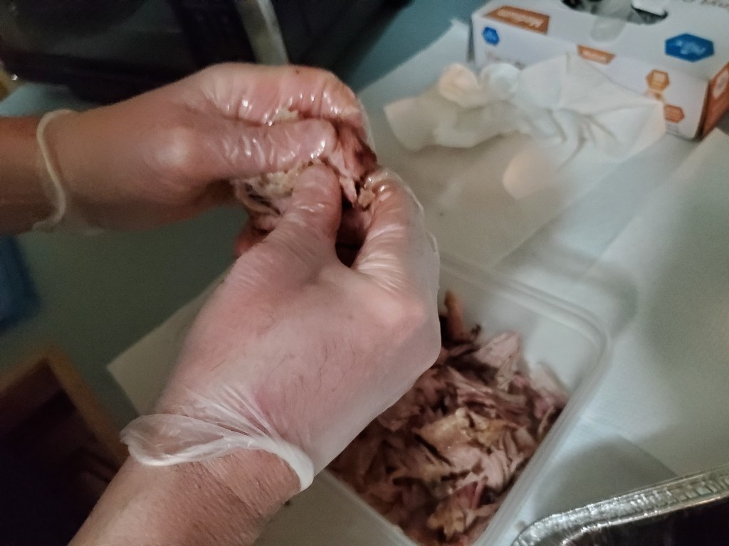 And putting the roast in the oven did manage to get the temperature moving. It reached the desired 200 degrees in about an hour-and-a-half. I then let it rest for an hour before beginning to pull the meat off and break it down into smaller pieces.