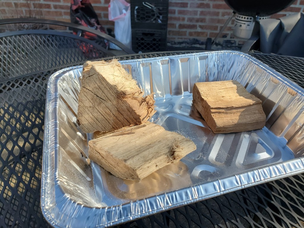 The two on the left are hickory. The one on the right is cherry-wood. I had already placed one chunk of hickory on the charcoal pile.