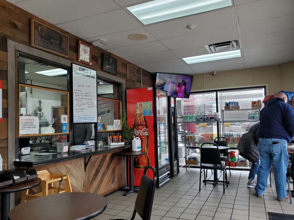 It sits in the lower level of a shopping center parking lot in a building that had formerly been a Checkers. Although they only have perhaps a half-dozen small tables inside, my friend, Jim, and I were able to grab one after I picked up my order at the counter. Curly’s popularity is such that they gladly accept orders a day or more in advance. I always place mine the previous day.