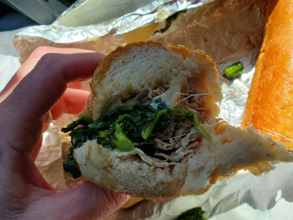 Hot roast pork sandwich with broccoli rabe and sharp Provolone cheese – a.k.a. the Roast Pork Italiano.