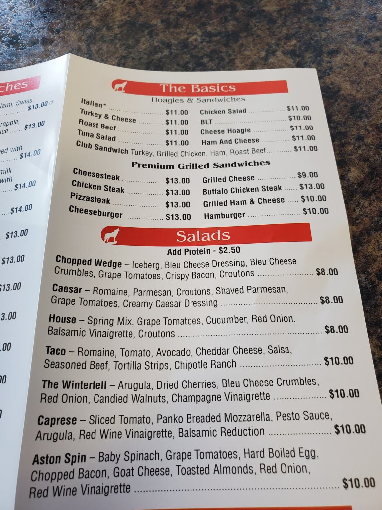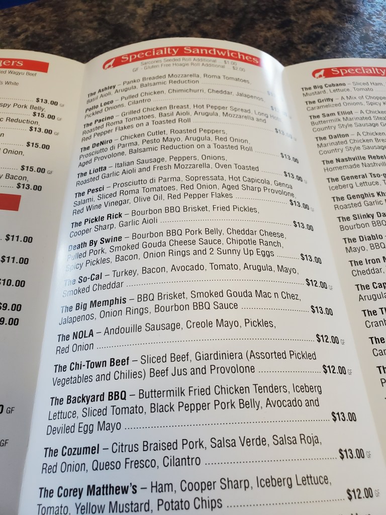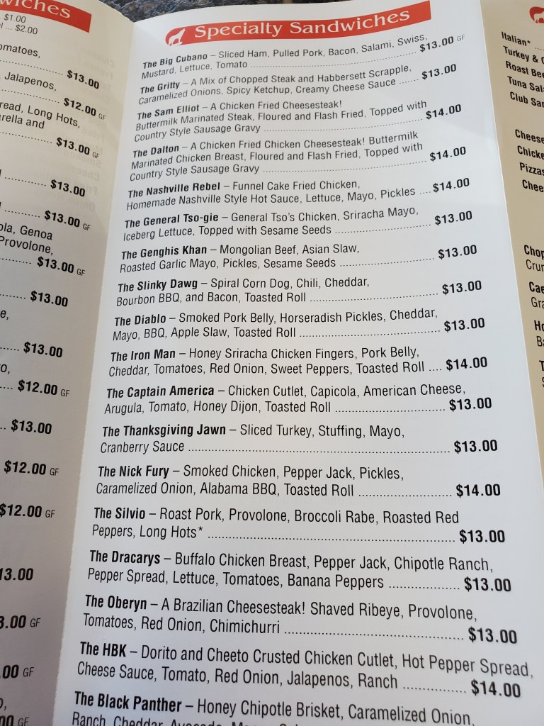 They have an unusually large and at times eccentric menu. I only photographed the sandwich portion of it. They also have appetizers and pizza.