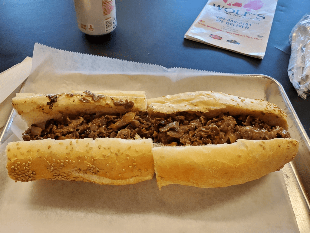 My first Wolf’s cheesesteak included 12 ounces of chopped meat. There appeared to be less on the one I had Wednesday. I would guess it was in the 8-10 ounce range. It certainly wouldn’t be surprising if inflation and the rise in meat prices over the past year played a role in that.
