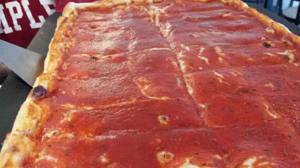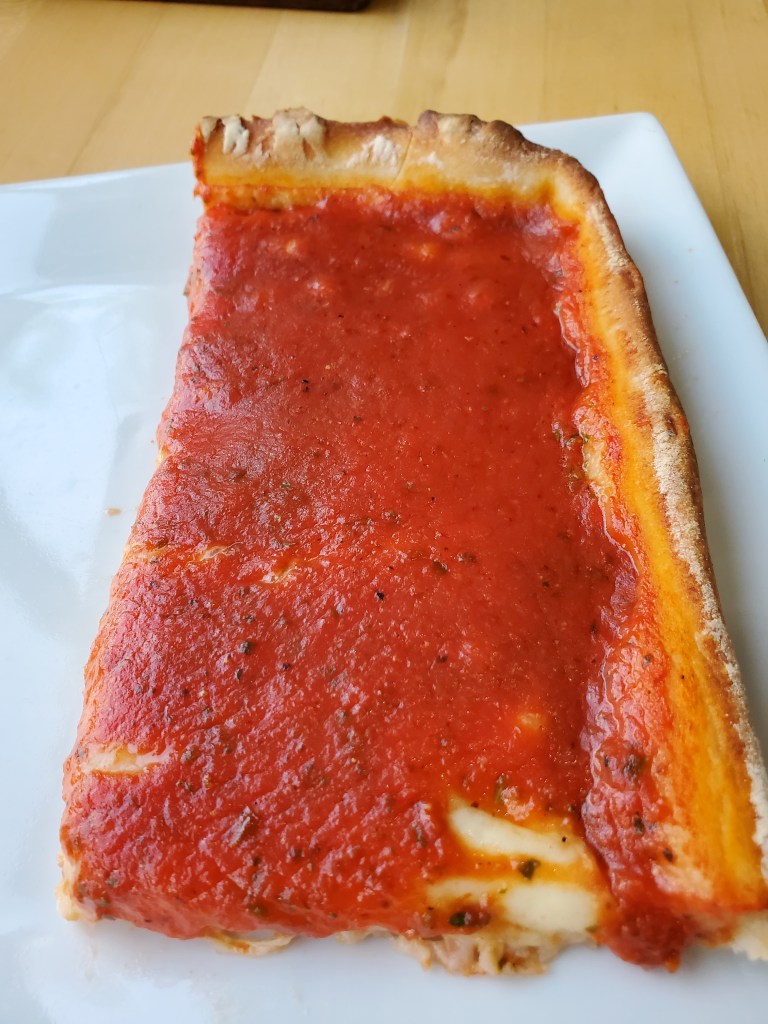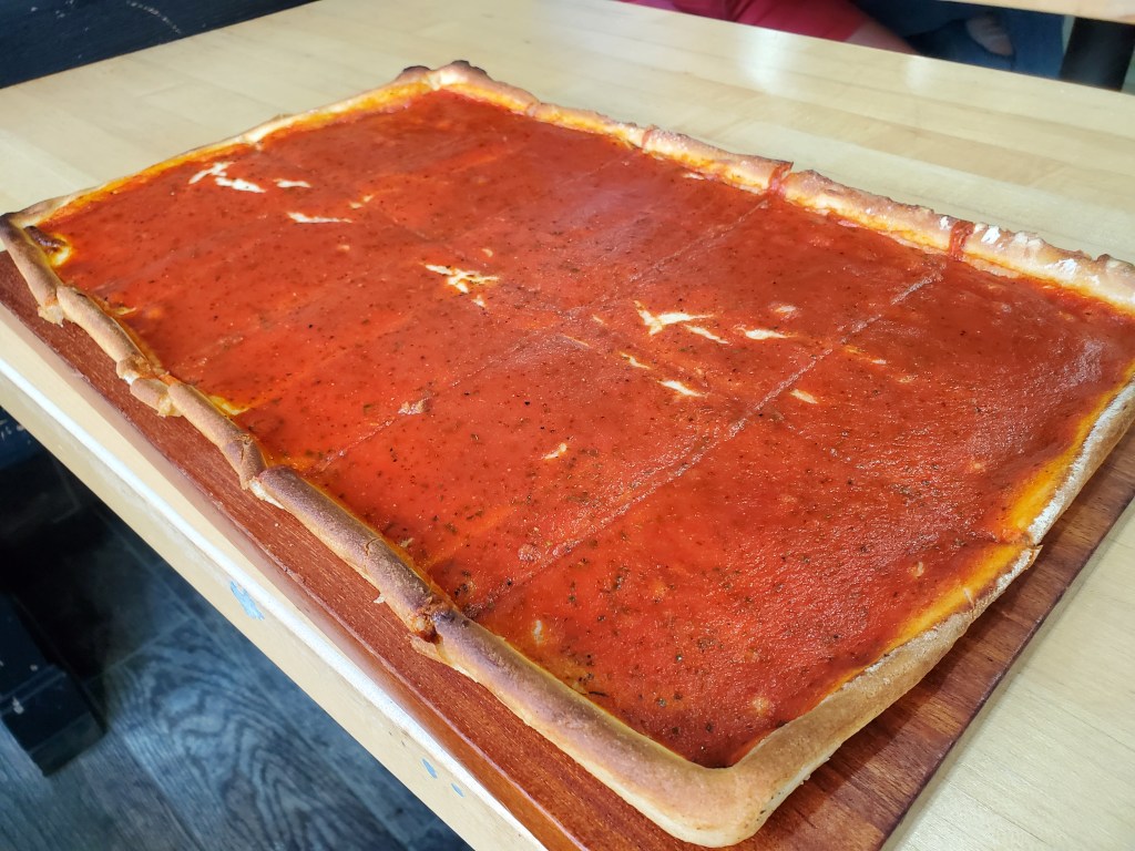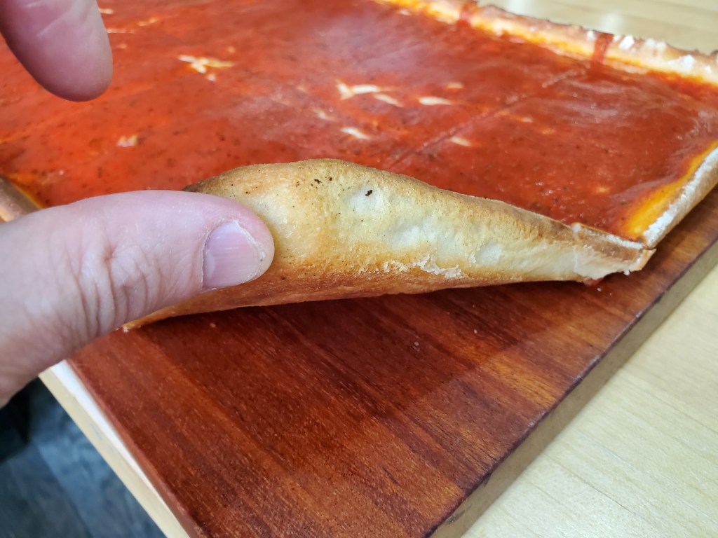 Someone new to this style of pizza might be underwhelmed by its appearance upon first glance. It features an unspectacular-looking rectangular crust with only a layer of red sauce being visible except for a few thin cracks of the melted sliced Mozzarella cheese beneath it.