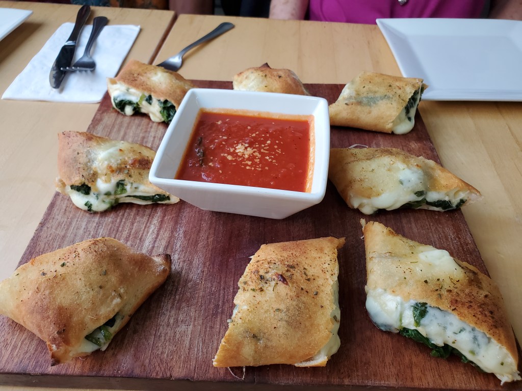 In addition to a large plain pie, my wife ordered a salad and my mother and step-father requested a spinach stromboli, which was served with tomato sauce on the side.