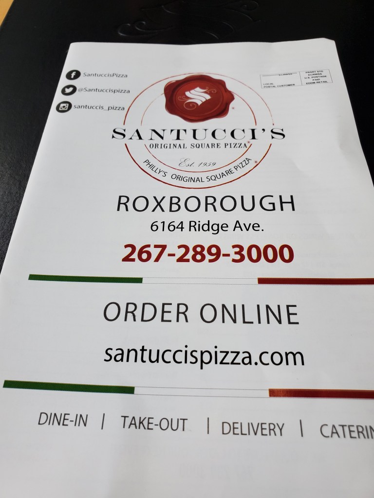 Sunday’s dinner with my wife, mother and step-father was at the Roxborough outlet from the larger of the two chains, which goes by the name of Santucci’s Original Square Pizza. The other one, which has only three locations, is known as Philomena Santucci’s Square Pizza.