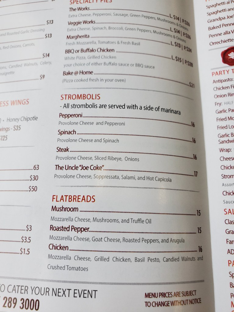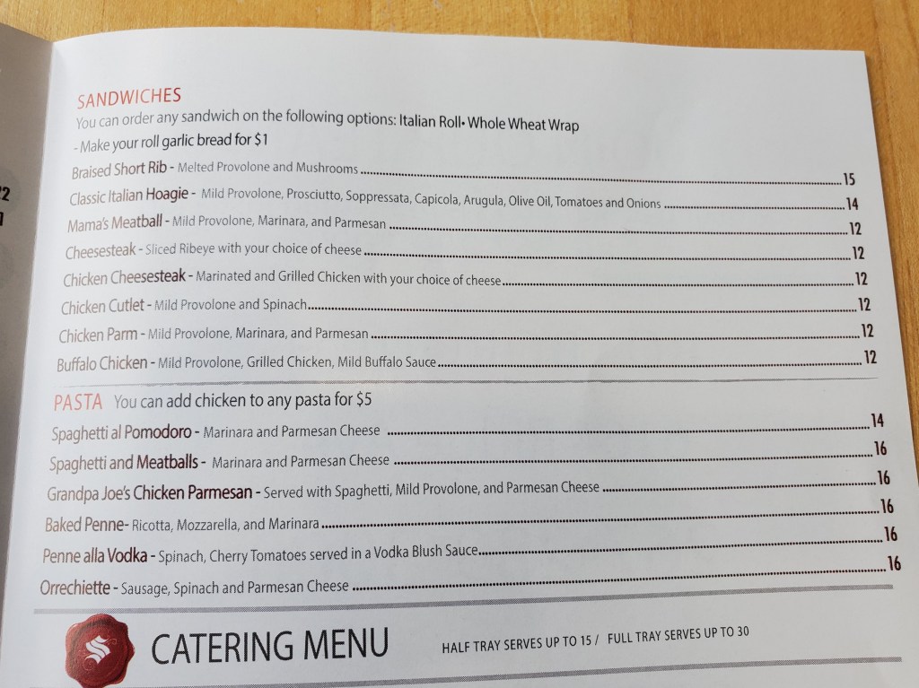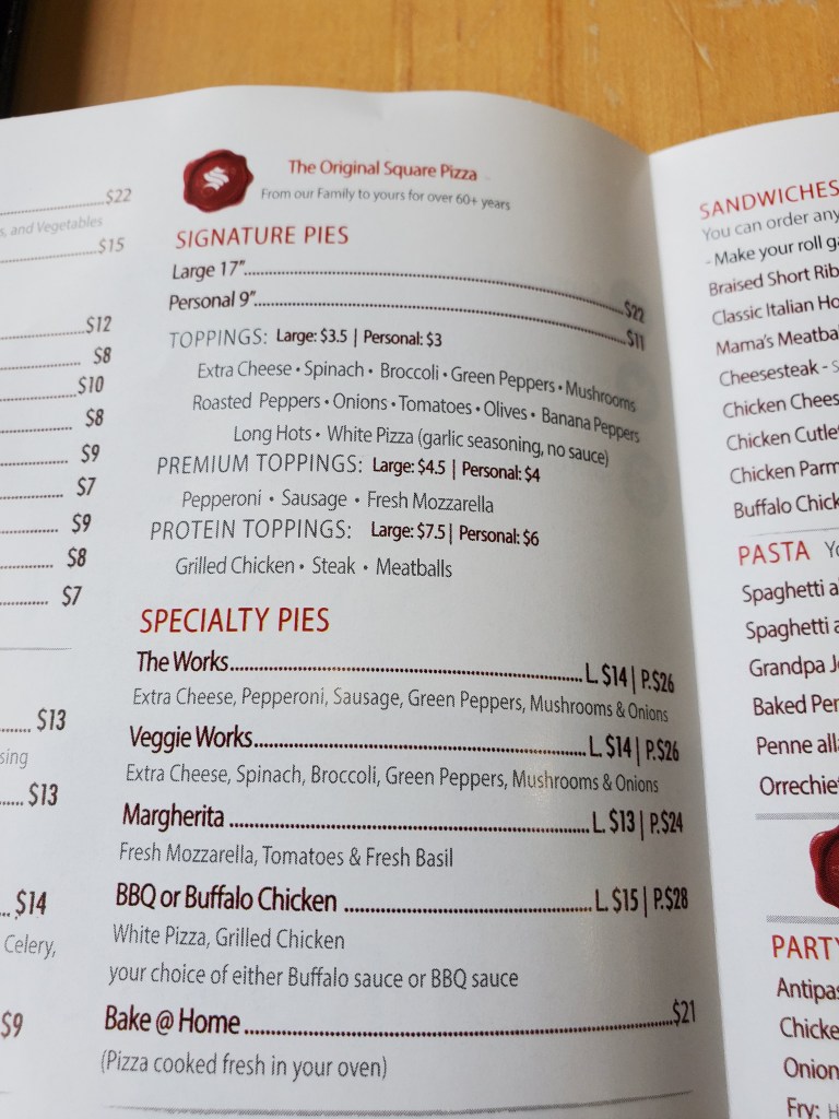In addition to their locally famous upside-down square and rectangular pizzas, the menu featured strombolis, flatbreads, pasta and a nice little selection of Italian long-roll sandwiches, including cheesesteaks.