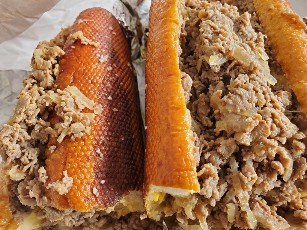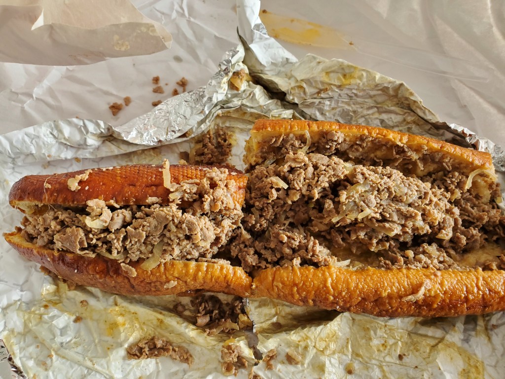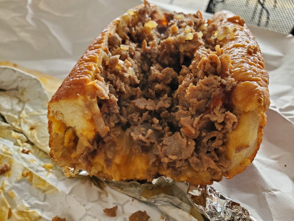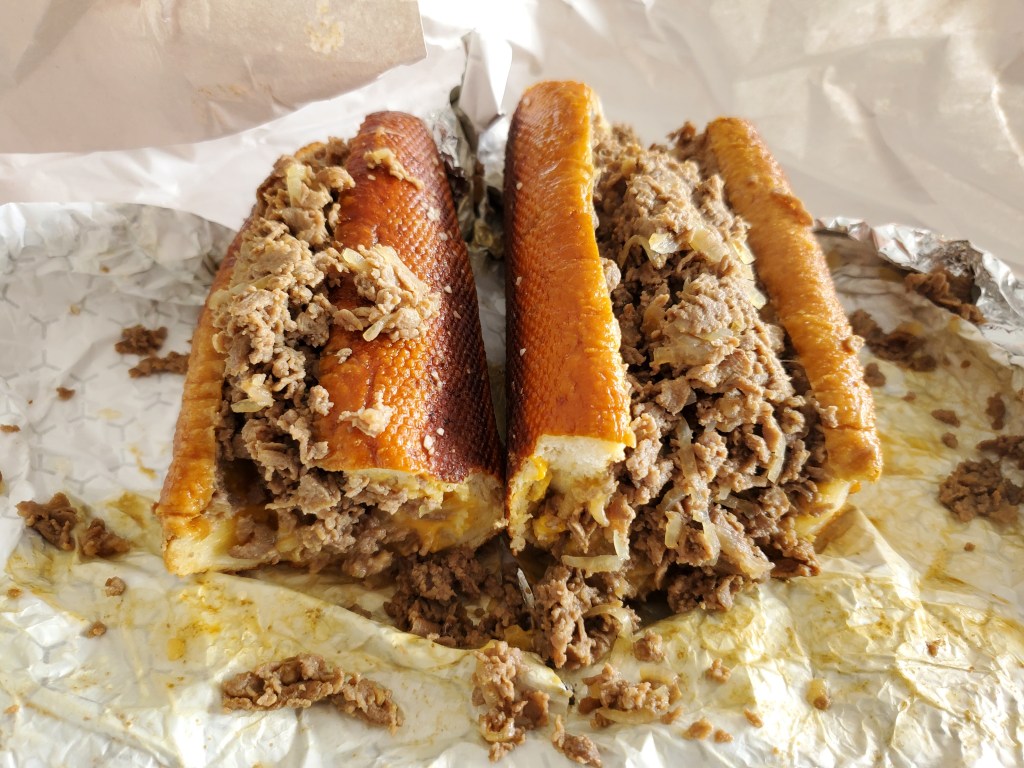 One reason I didn’t was my intention to unwrap the cheesesteak almost immediately upon getting it. But even with that being the case, by the time I finished opening the foil and paper layers that encased the steak, it was a bit of a mess, with bits of meat falling out and one side of the roll looking like it had absorbed a lot of moisture.