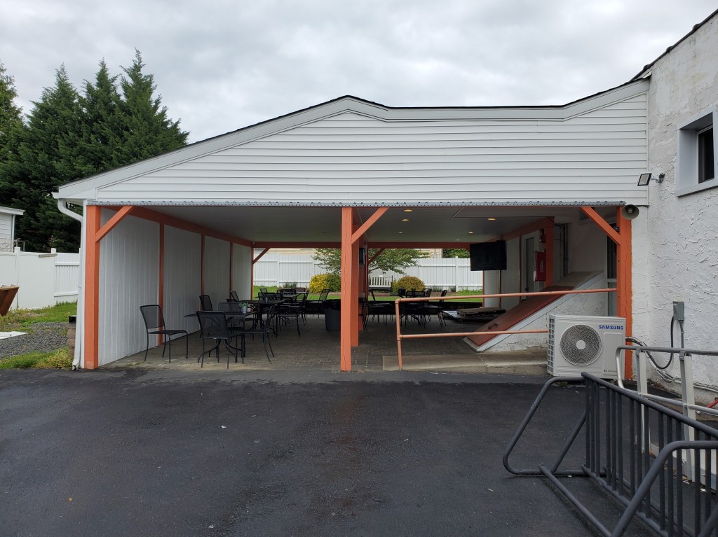 Another surprise – and a very pleasant one – was their large covered and partially enclosed outdoor seating area, which is very nicely laid out and includes condiments, napkin dispensers and a large-screen TV. I had been thinking I’d have to eat my steak in the car, but that turned out not to be the case.