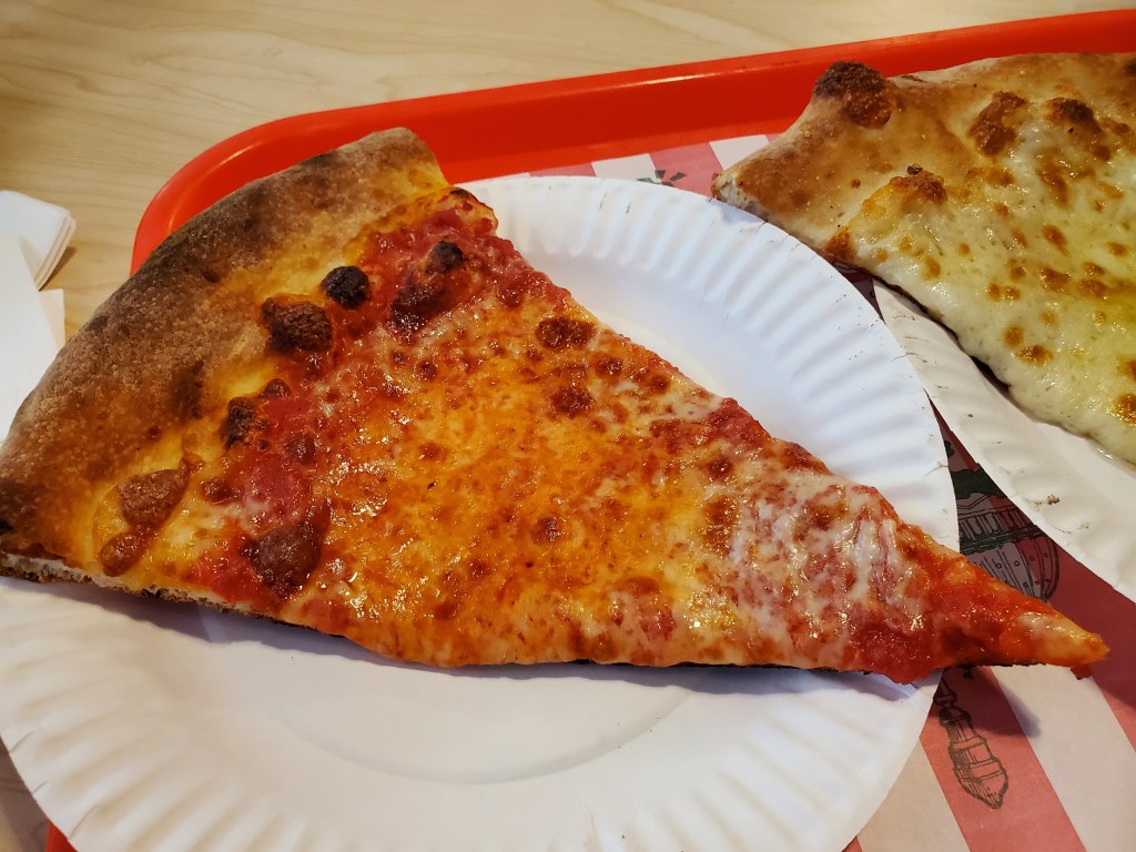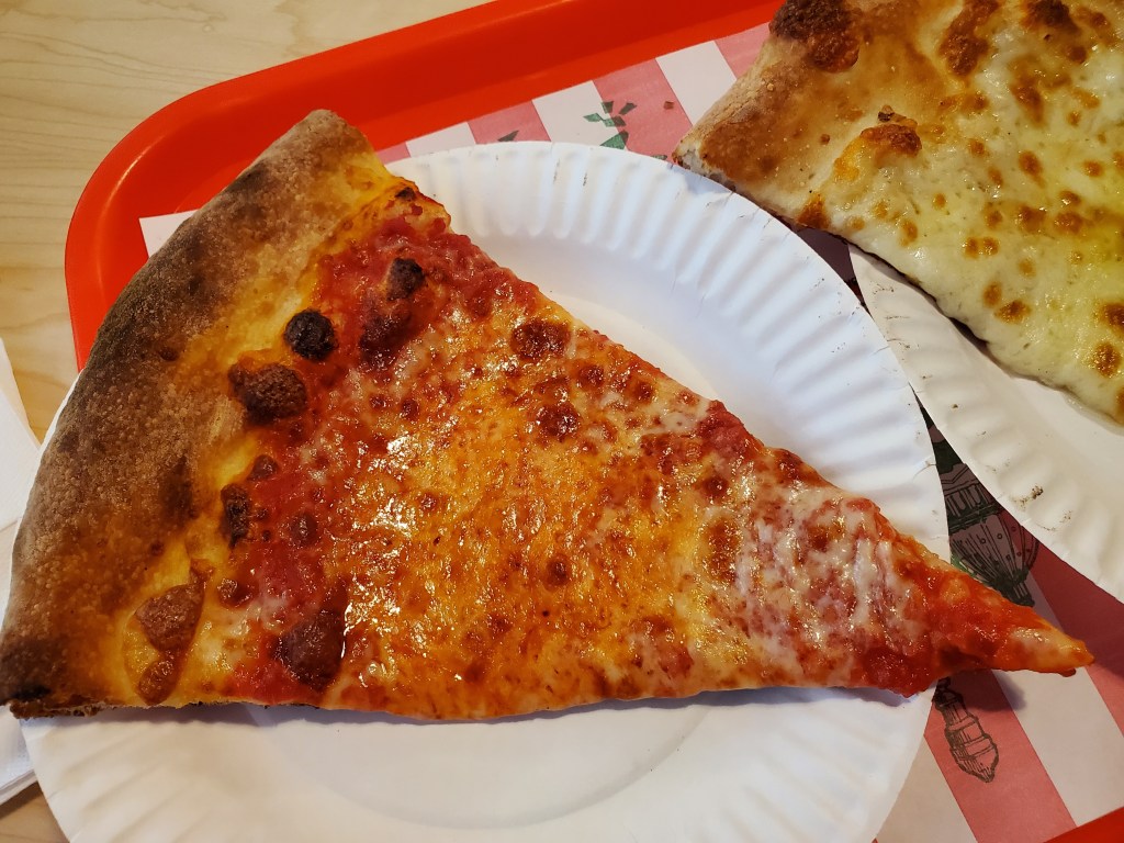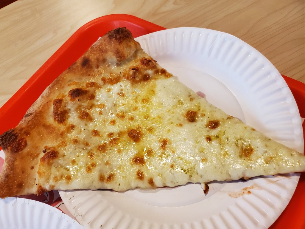 After enjoying a quick lap around the place, I moseyed up to the pizza counter and took a good look at the selection. There were a handful of options, but I kept it simple by going with a slice each of plain cheese and The Mootz (plain white).