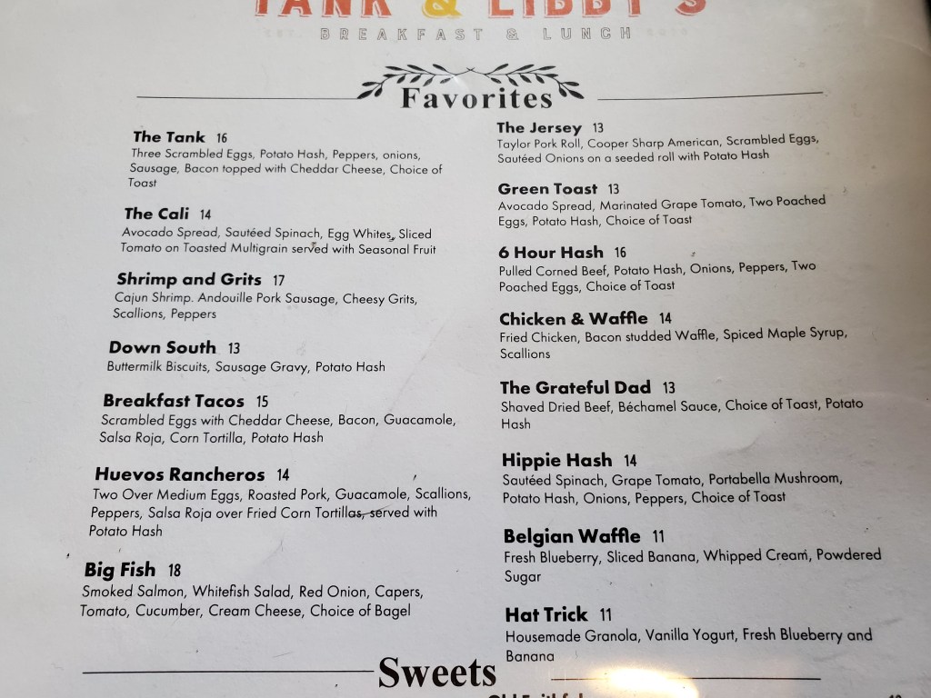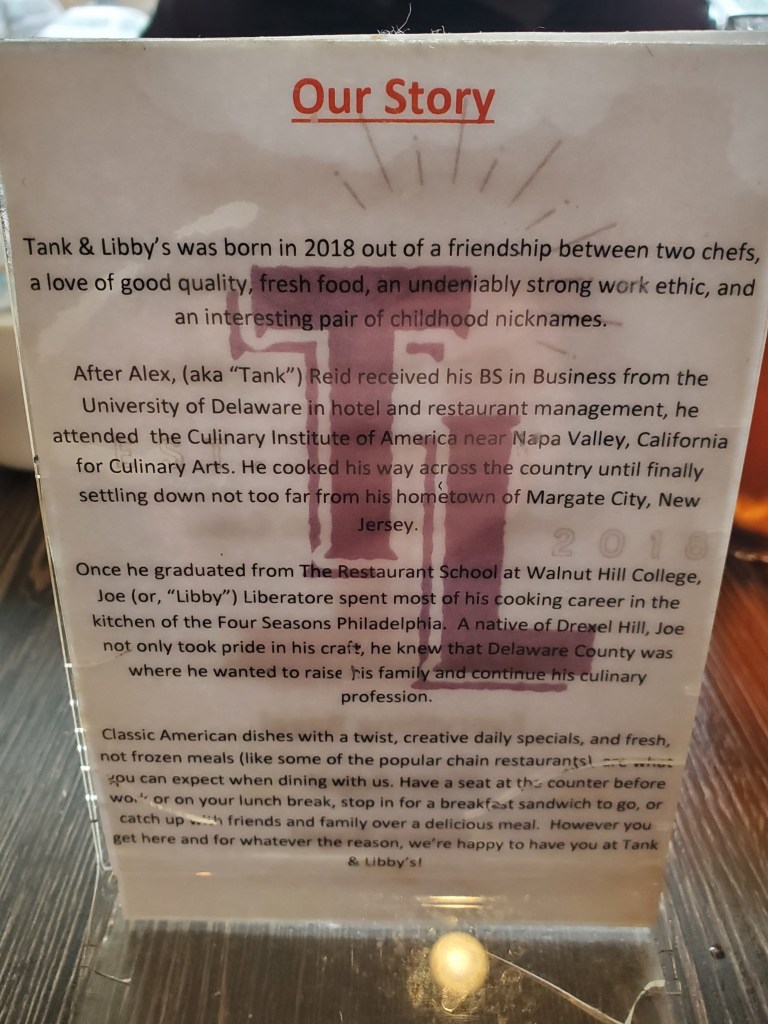 Years after most Philadelphia area luncheonettes closed for good, a new breed of restaurant that serves breakfast and lunch only has come to the fore in the local dining scene. In both the city and suburbs a growing number of places have made brunch a meal option all week long. And none of those that I’ve come across has a more interesting bill of fare than Tank and Libby’s of Drexel Hill, Pennsylvania.