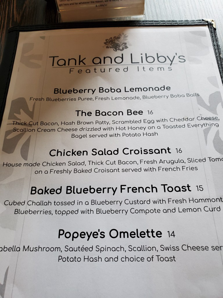 The menu at Tank and Libby’s is eye-popping. There were numerous items on it that I would have jumped on without hesitation if not for the presence of the other possibilities. In fact, I can’t remember the last time deciding what to order was such a dilemma.