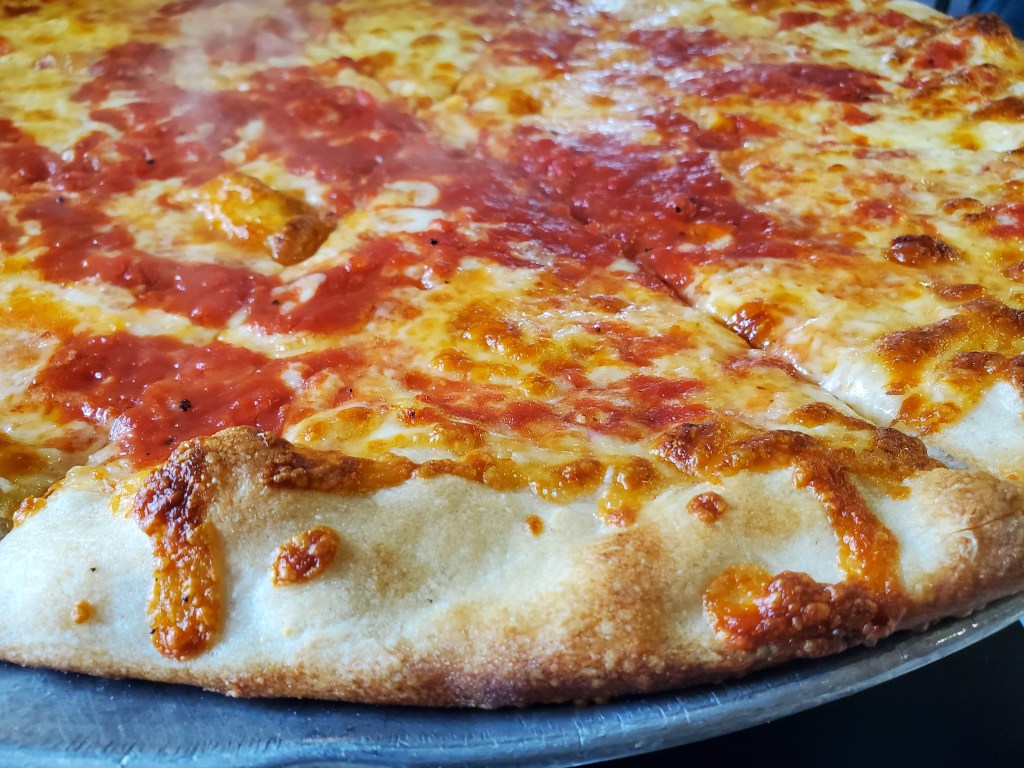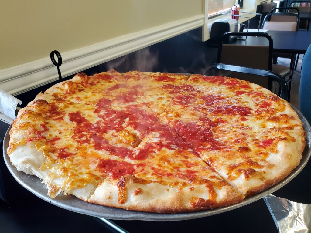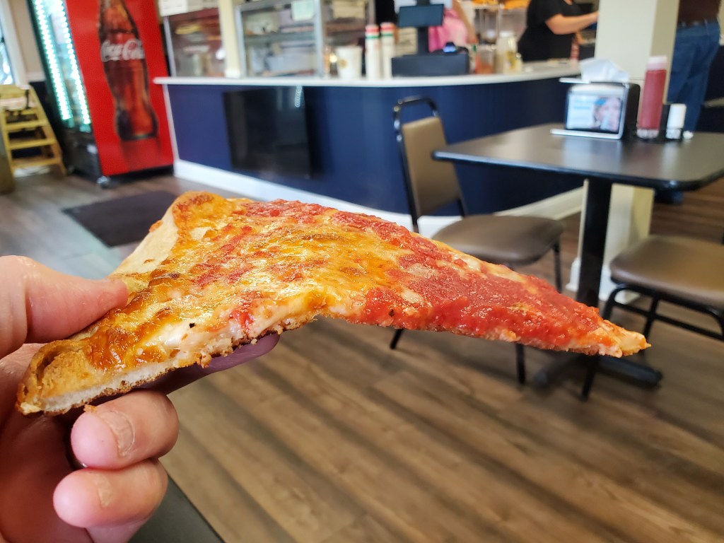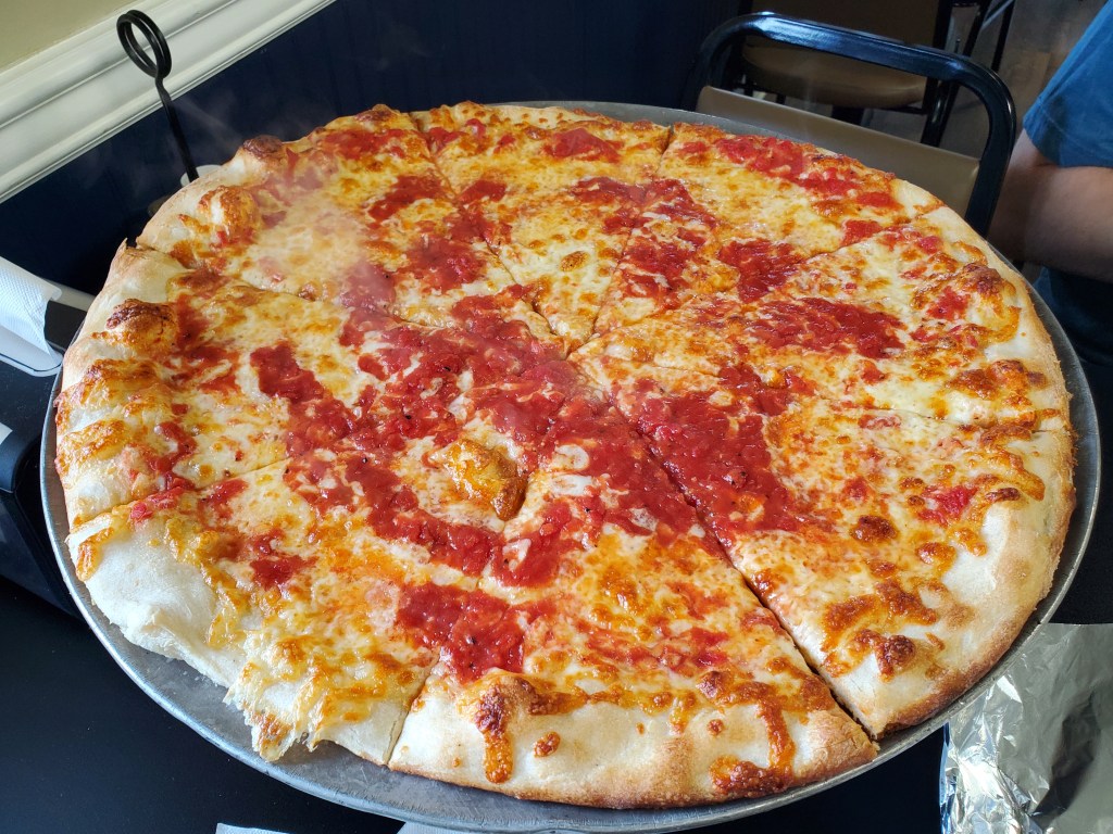 As you can see, Trenton-style tomato pie features sauce swirled on top of the Mozzarella cheese. The crust isn’t as well-done or hard as you’ll find in Connecticut or Brooklyn, but it’s not soft either and manages to be extremely sturdy.