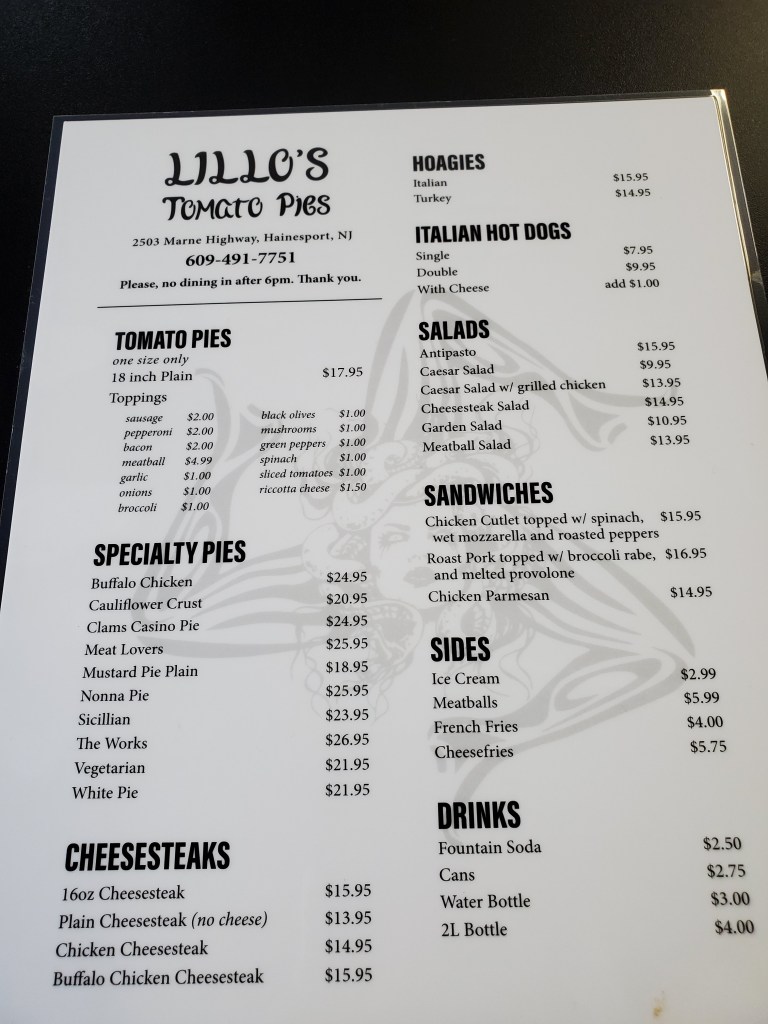 Many of you already know that there are a lot of restaurants in the Philadelphia area that serve both cheesesteaks and pizza and that I do my best to try each when going to such a place. But there were only two eateries that made both my top ten list for cheesesteaks and top five for pizza eaten on the steak trail last year.* One was Angelo’s Pizzeria in South Philly, which I’ve raved to the sky about following each of my visits there. The other was Lillo’s Tomato Pies of Hainesport, New Jersey, which I returned to for an early lunch Friday.