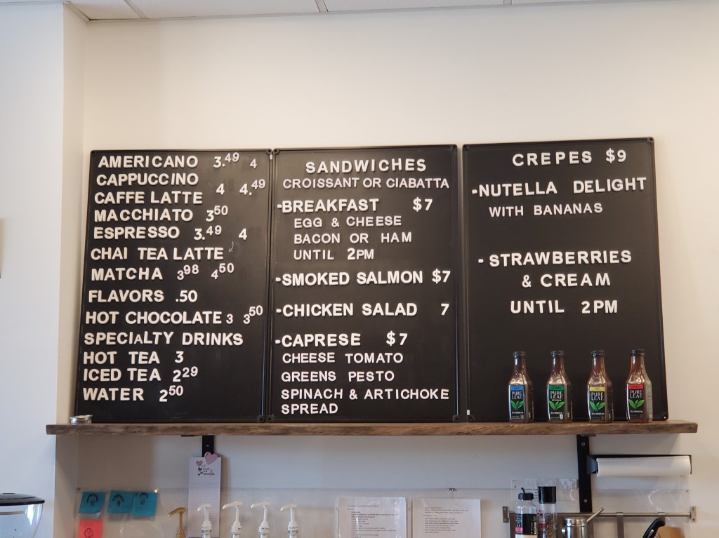 They also had a small but appealing selection of freshly made sandwiches that were appropriate to the place’s atmosphere. My wife went in that direction and ordered a Caprese on a ciabatta roll. After considering ham, egg and cheese on a croissant, I instead opted for a small savory pastry that was labeled Bistro Leek Parmesan and an Almond Bear Claw.