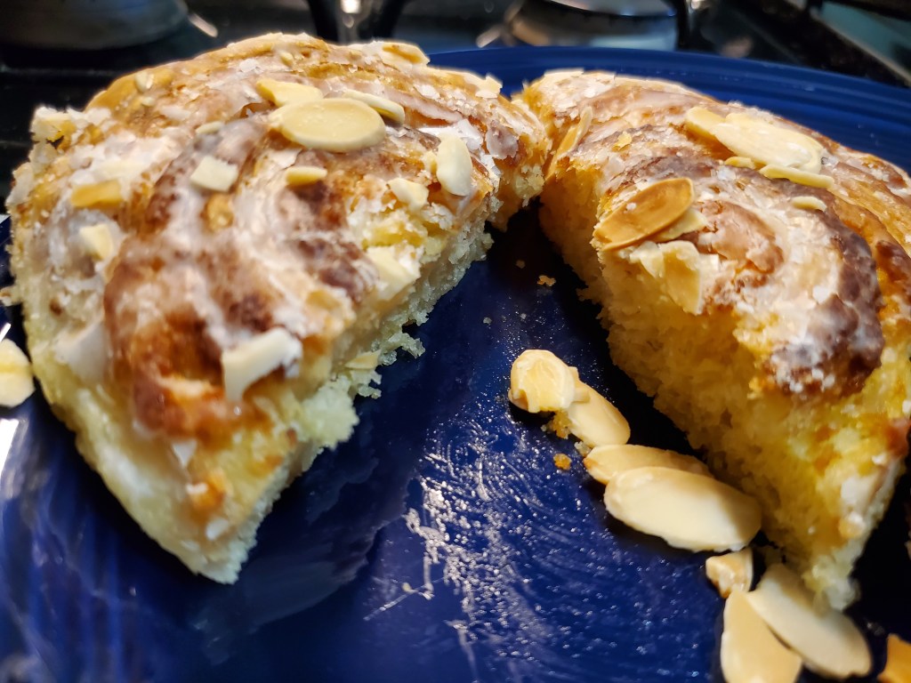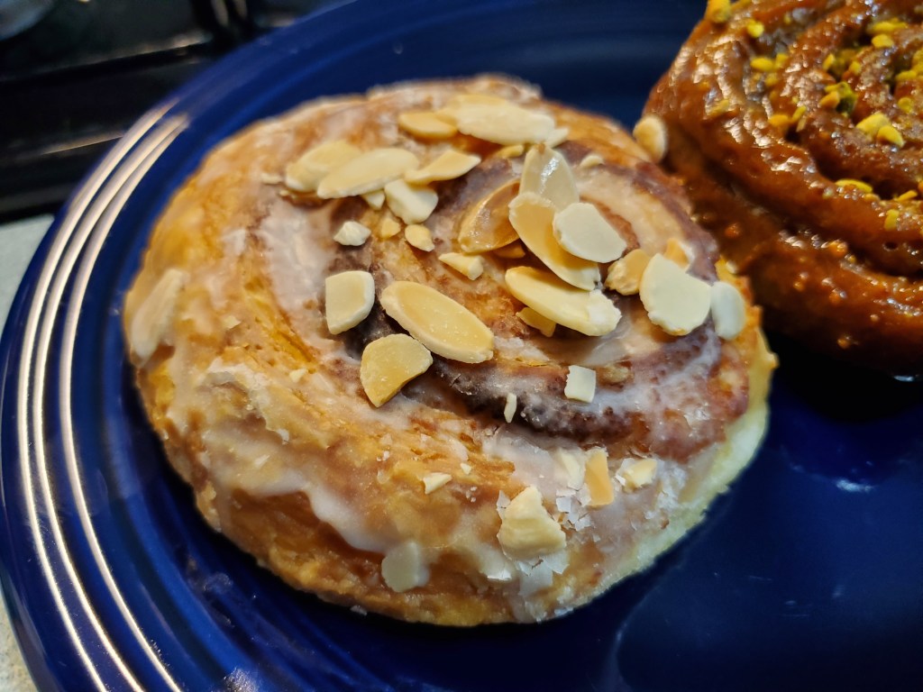 K’Far is owned by Michael Solomonov, one of Philadelphia’s top chefs and a man with a great track record. So it wouldn’t be surprising for their pastries to be a cut above the norm. I went nuts – no pun intended – over a Pistachio Sticky Bun from there a couple weeks ago when my wife brought one home. She had another of those as well as an Almond Marzipan Challah Danish this time around.