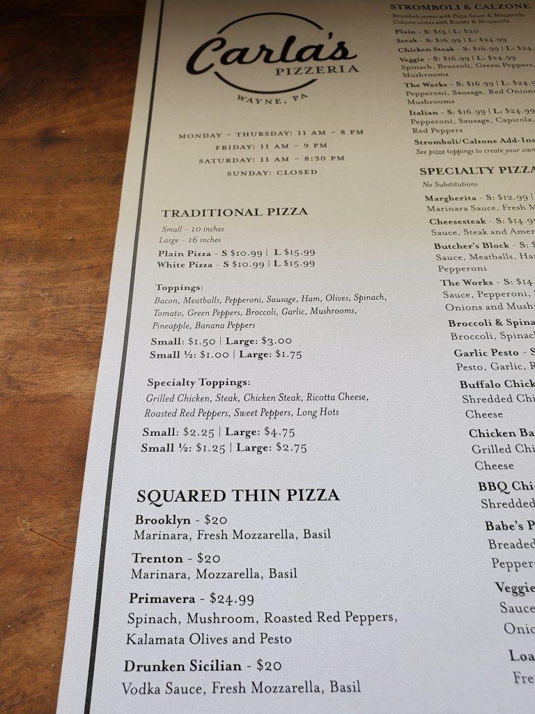 Carla’s Pizzeria has a counter with a few stools but is mainly a takeout shop. While I often like to eat on site, that worked out fine for me on this occasion, as I intended to take my order home to share with my wife for lunch.