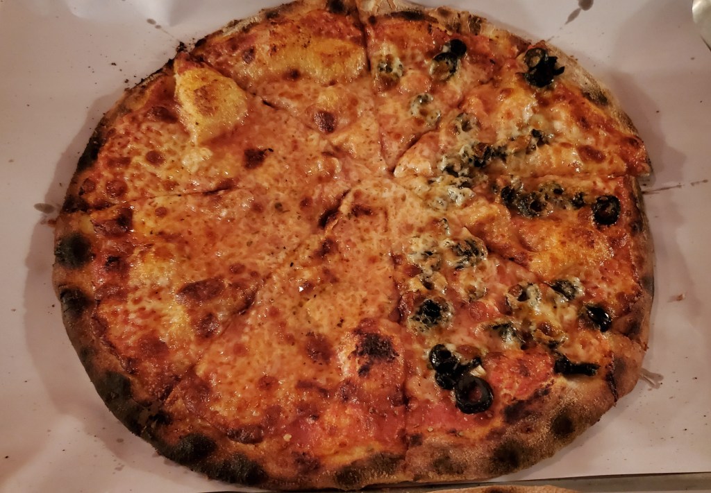 The crusts were well-done, as is generally the case with apizza. They also managed to have the desired chew, while the cheese and sauce on the plain half were bursting with flavor. That pie in particular was unquestionably one of the better ones I’ve had over the years and worthy of its lofty reputation.