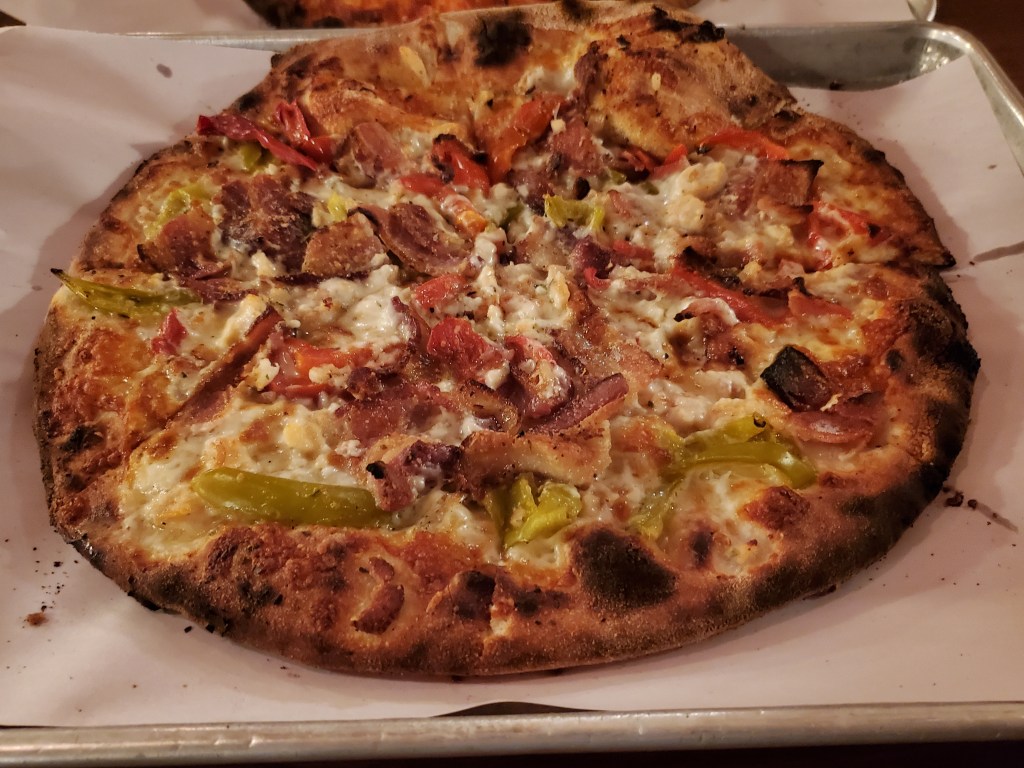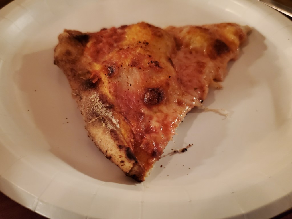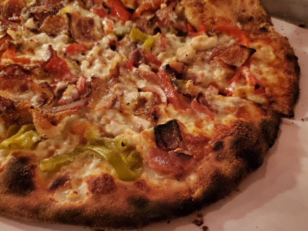The other pie was also excellent. It really did have the flavor of clams casino – in fact, it tasted better than the version we had at the previous day’s lunch in East Windsor. My only minor issue was that there was a bit too much going on in terms of how crowded this pizza was with toppings. I wound up removing a few of the peppers.