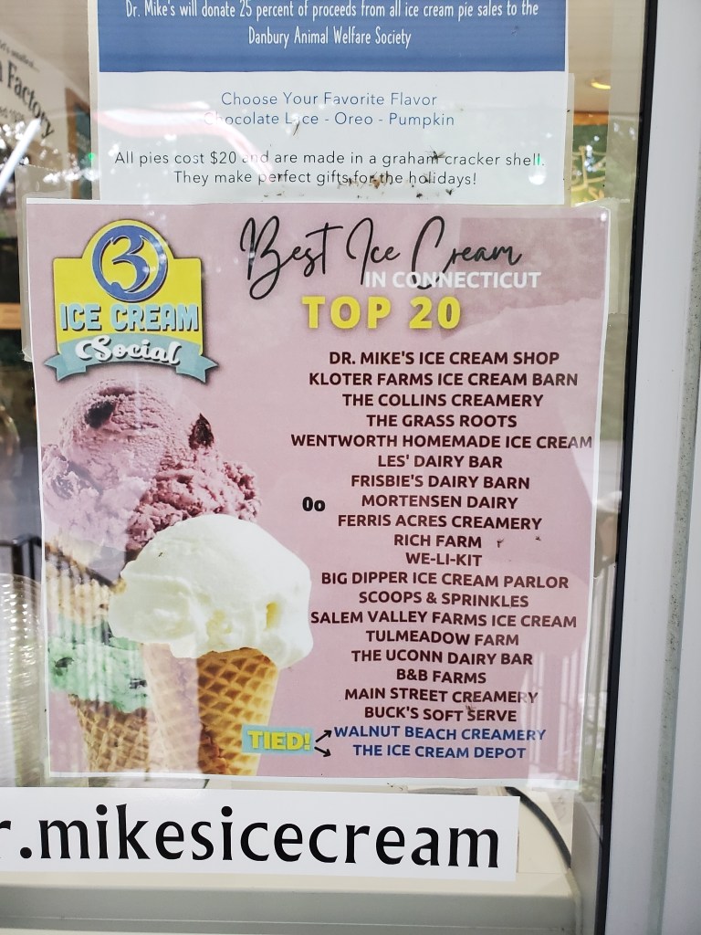 The trip could have been over at that point. We had both enjoyed more than our fill of great food in the previous 24 hours. But rather than heading home on 95, we decided to cut across southern Connecticut to take a different route. And doing so took us right through Bethel, the home of one of the state’s best known ice cream parlors – Dr. Mike’s.