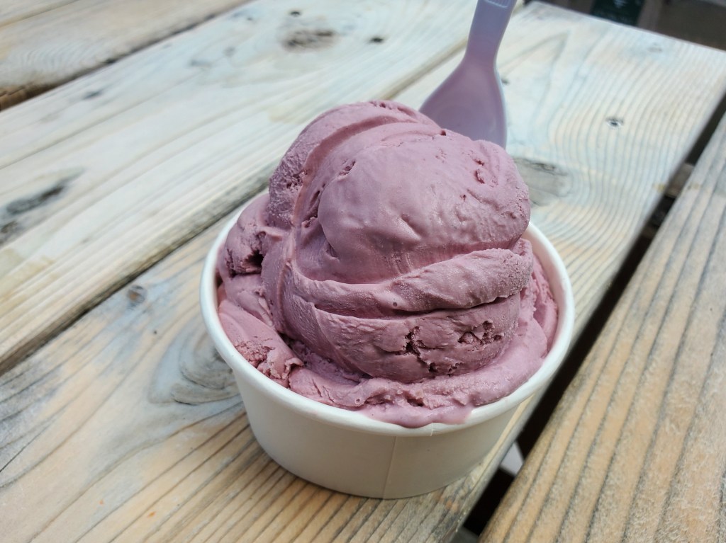I wasn’t in love with their flavor selection and settled on a small scoop of black raspberry, while my wife went with a kiddie scoop of chocolate lace, which was sweet cream ice cream with chocolate-covered caramel chunks.