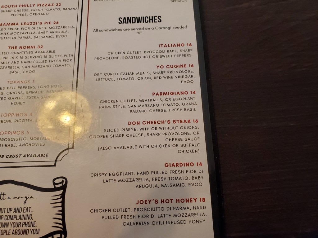 The menu is identical to the one at the other spot. My step-mother only wanted a chicken Caesar salad and I didn’t have the appetite to consider sharing a pizza or appetizer in addition to the cheesesteak.