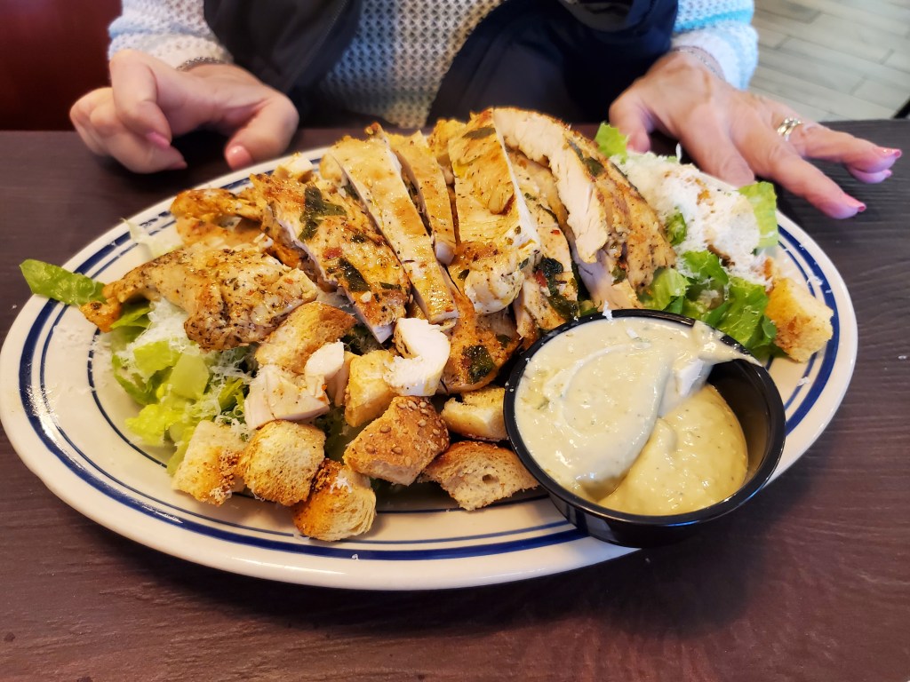 The Caesar salad was almost comically enormous, especially considering my step-mother’s limited appetite. She’ll probably be eating the leftovers for at least a couple more days. Aside from the portion size, she mentioned that it was good and that the chicken was warm and tasty.