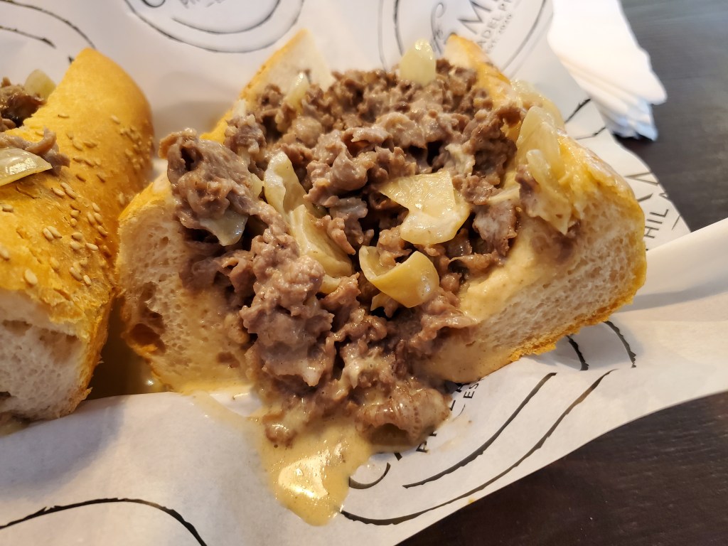 When my cheesesteak arrived, the first thing I noticed was that the meat wasn’t evenly distributed between the two halves, with one having considerably more than the other. But that turned out to be the only negative aspect of this sandwich.
