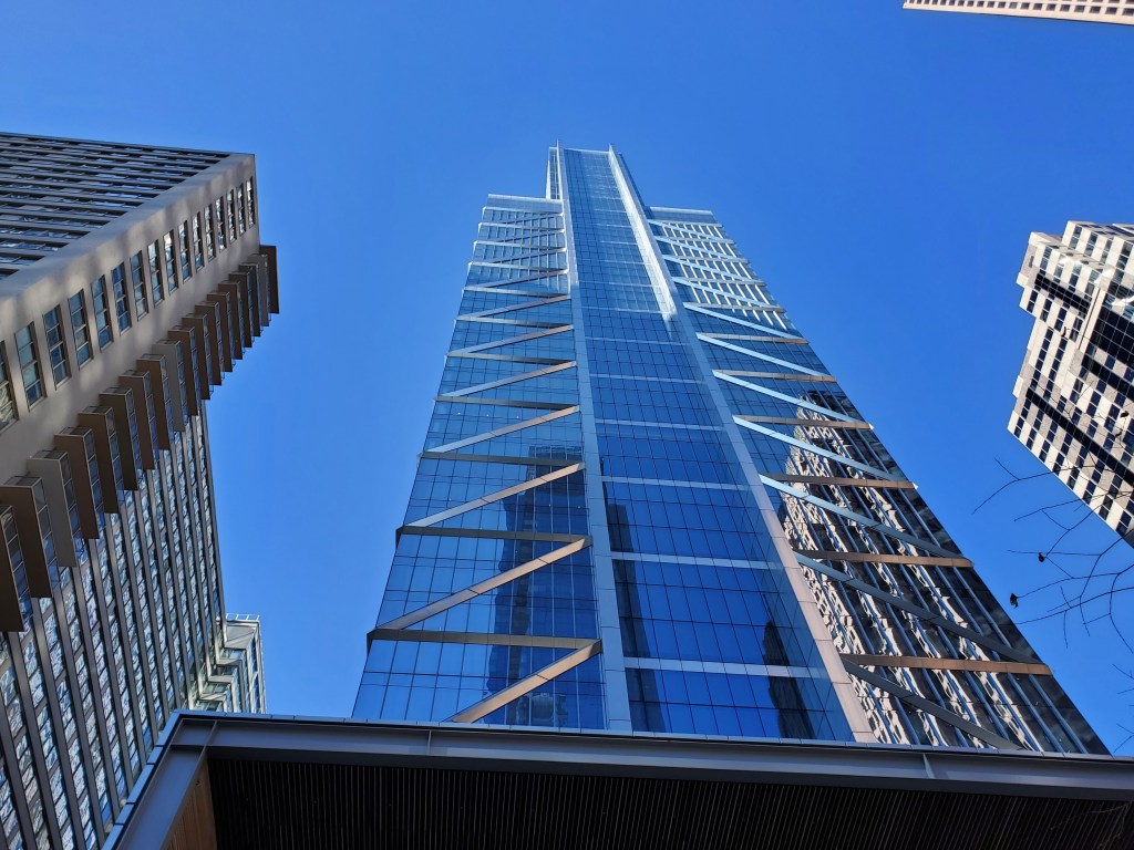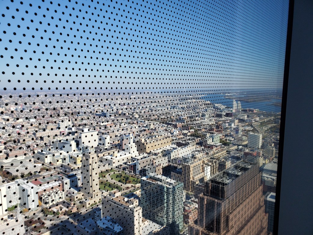 After we had finished our lunch, Nancy suggested that we take the elevator up to the Four Seasons Hotel lobby on the building’s 60th floor to check out its great view of the city. It was a high speed elevator that I probably wouldn’t want to take on a regular basis, but the view we were hit with when we arrived in the lobby was spectacular enough to make me quickly forget about any minor dizziness.