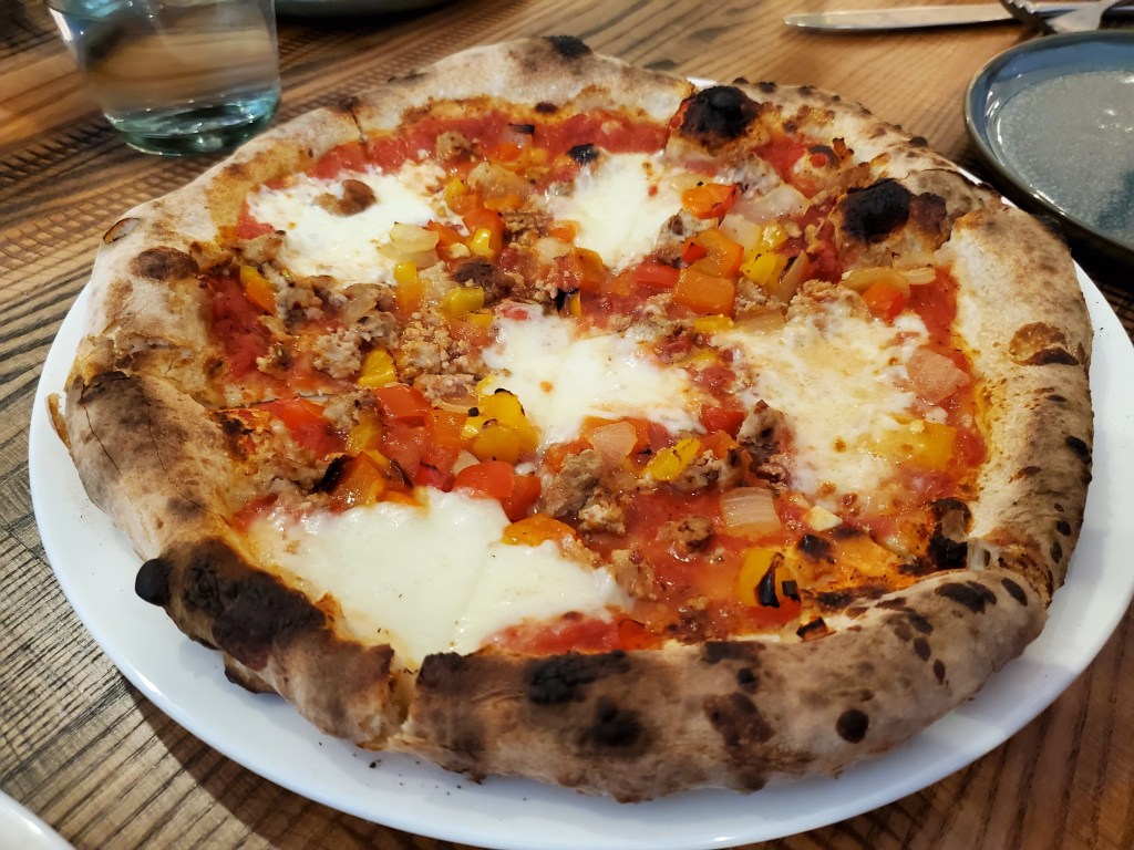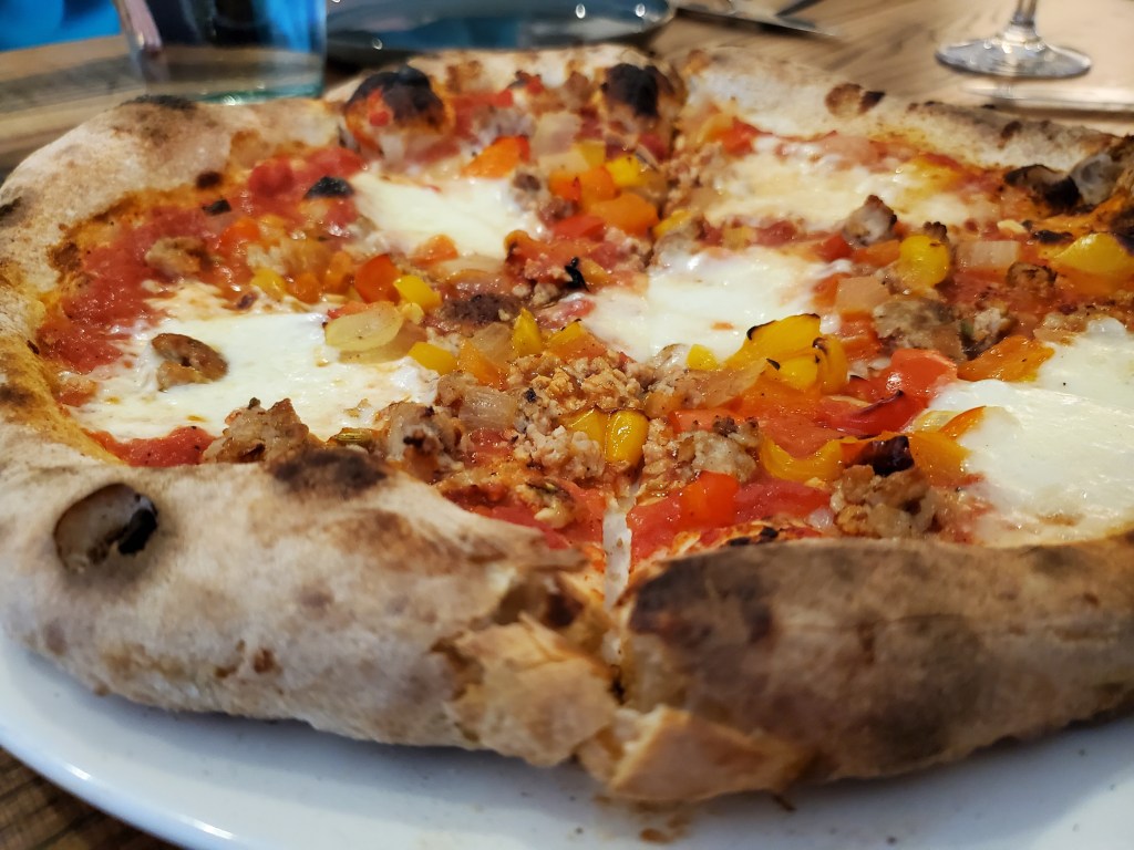 While I thought a pair of 12-inch pies would be enough food, Nancy insisted that we try three flavors for the benefit of this blog post. She loves pepperoni, so we requested it on half of a South Philly Margherita pie. We also ordered a Fiorella sausage and peppers pie. Fiorella’s was a sausage butcher near South Philadelphia’s Italian Market that was in business for over a century. Vetri now owns a pasta restaurant in the space that it occupied.