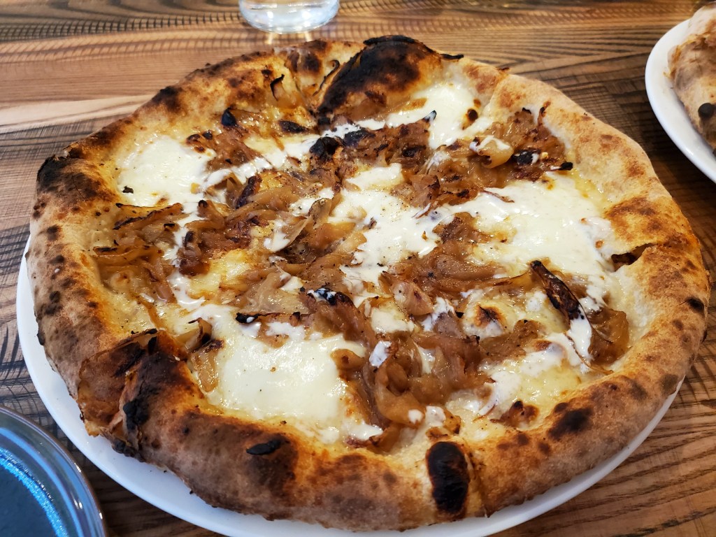 For the third pizza, we wanted to try something white and had our options down to a clam pie and the Ode to Sweet Onion Crepe. We decided on the former but didn’t notice that it had been deleted from the menu, leaving us no choice but to go with the latter. It’s named after a legendary dish that is served at Vetri Cucina. My wife and I sampled it both times we ate there, and each of us considered it to be among the best things we’ve ever eaten.