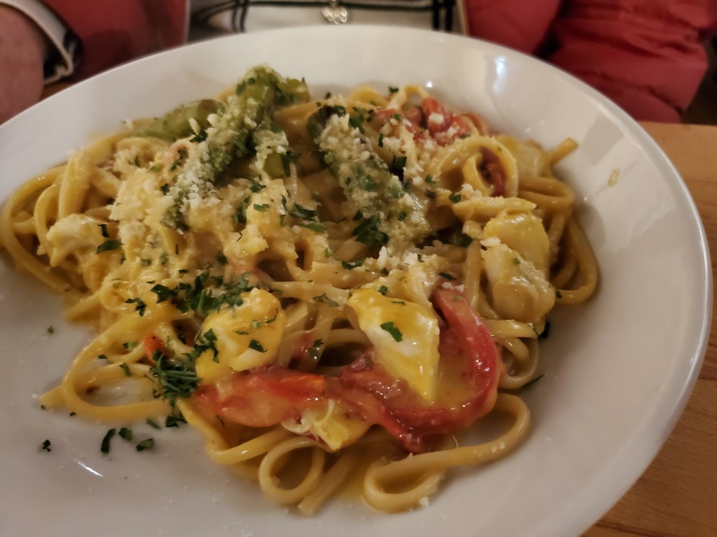 My mother’s linguine with crab meat came in a slightly creamy white sauce while my Pyramid Pasta was accompanied by a lobster cream sauce. Both dishes included asparagus.