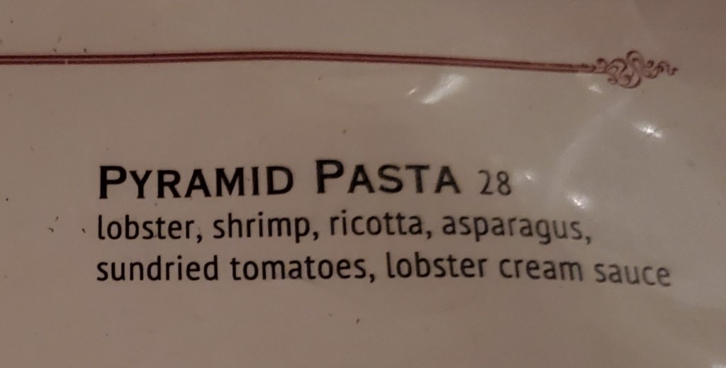 From browsing their menu online periodically over the years, I’ve been impressed with Mercato’s pasta offerings. One in particular that always jumps out at me and has been on the menu for as long as I can remember is called Pyramid Pasta, which is detailed in the photo right above this paragraph. I was determined to find out if it tastes as good as it looks on the menu and ordered it as my main course. My mother opted for a linguini and crab meat special.